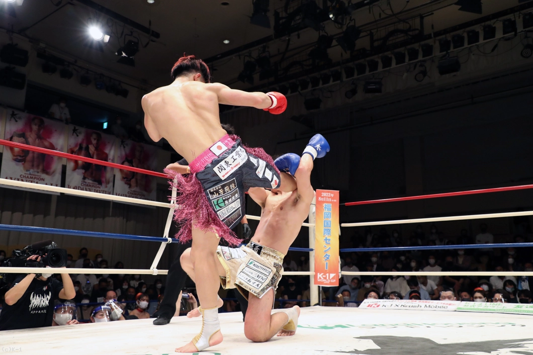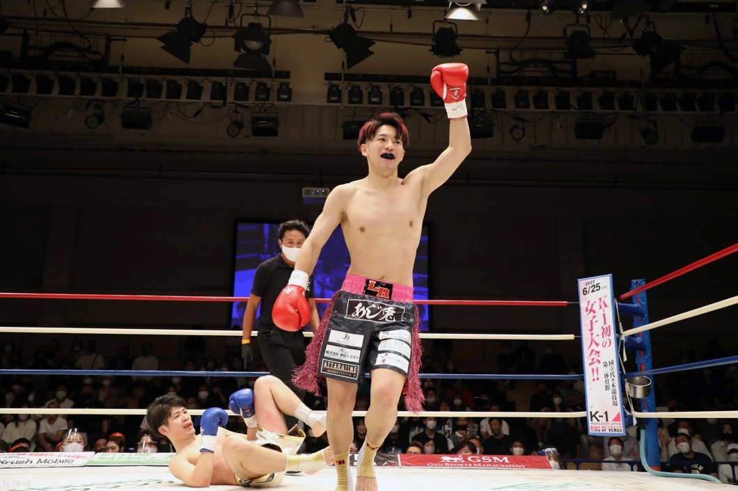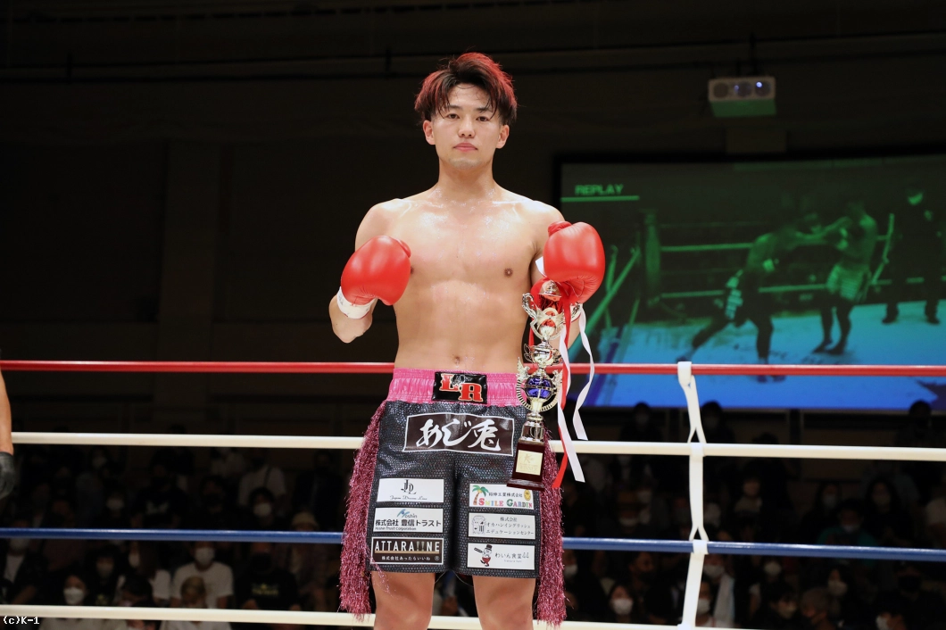 ダウンを獲った攻撃は手応えあったんですけど、あそこで倒れないところがやっぱりライト級で戦っていたの+他団体の王者としての意地が見えたので、僕もまだそこが甘かったなと。まだまだ倒せる武器を持たないとなと思いました。今後は連敗せずに復帰戦を勝てたというのは僕にとって一つ課題をクリアできたので、これからどんどん上の選手を倒していってまたベルトに向けて頑張りたいなと思ってます」