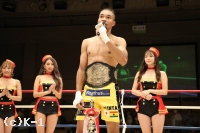 「こんにちは! 今日はたくさんの応援本当にありがとうございます。チャンピオンになってプレッシャーもあったんですけどKOでメインを締められてよかったです。Krushも好きなんですけどK-1も大好きで、次戦があったらK-1っていう鳥肌の立つ舞台でまた試合をしたいので、また応援よろしくお願いします。今日は応援ありがとうございました」