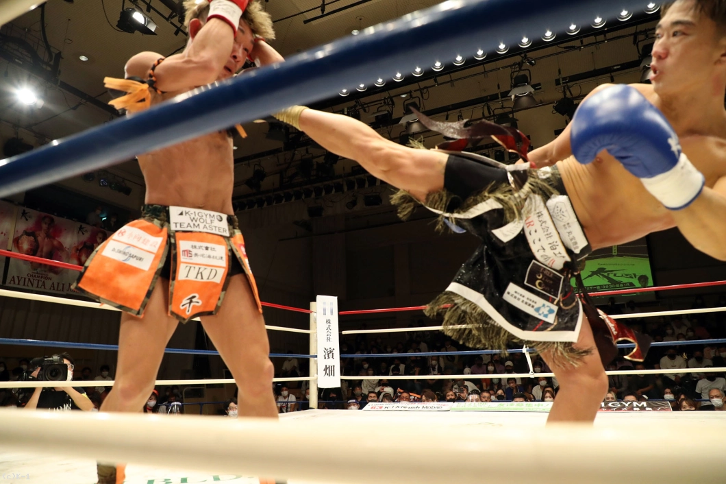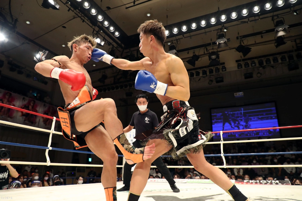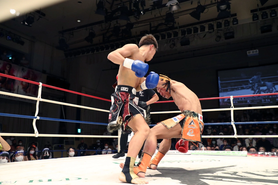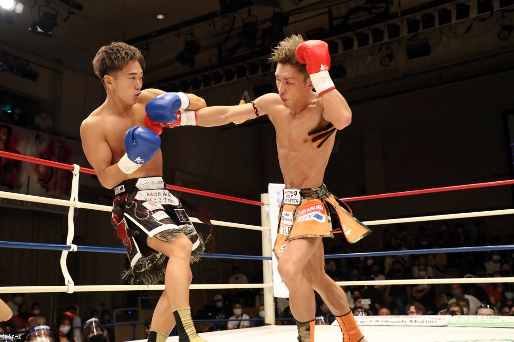 1R、覇家斗は右ミドルを入れてスタート。その後も右ミドル、右ローを國枝に当てていく。カーフキックも織り交ぜる覇家斗だが、國枝は右ストレートを入れて打ち合いに呼び込み、連打で覇家斗の腰を落とさせる。体勢を戻した覇家斗は再びカーフキックを当てるが、國枝も左フックを入れる。