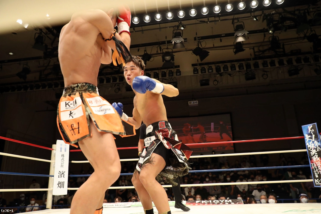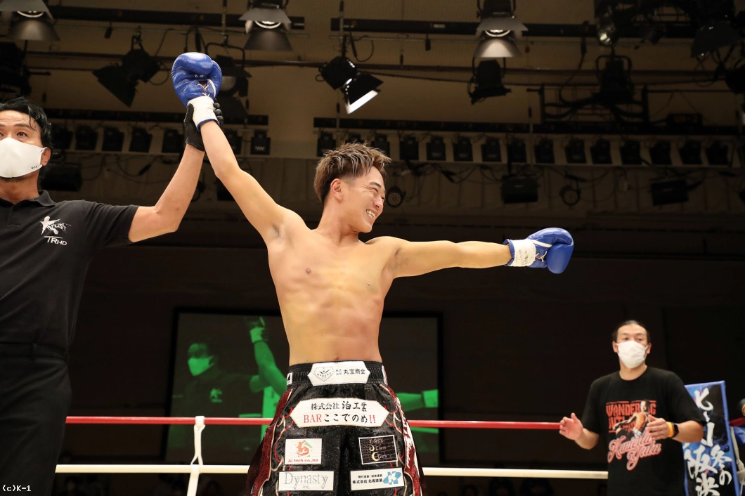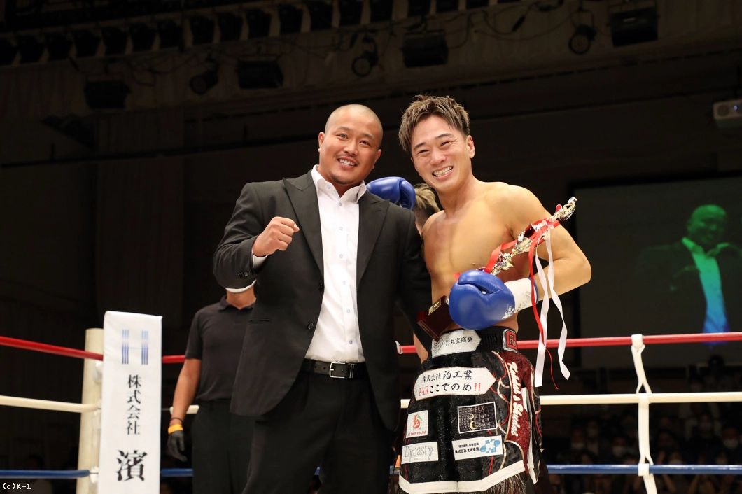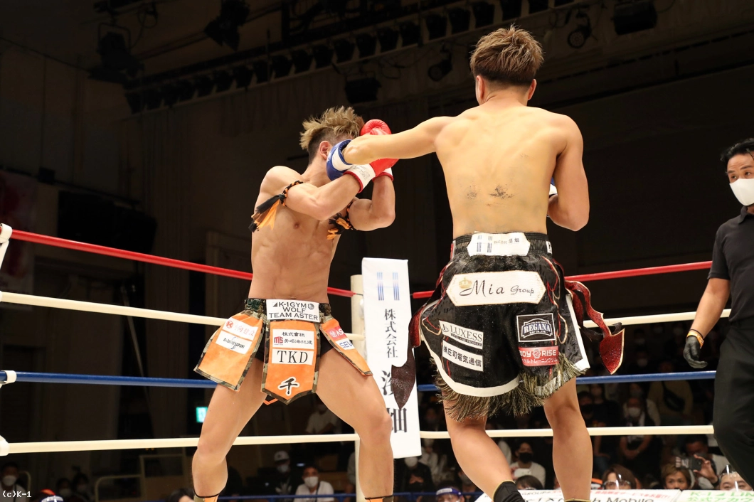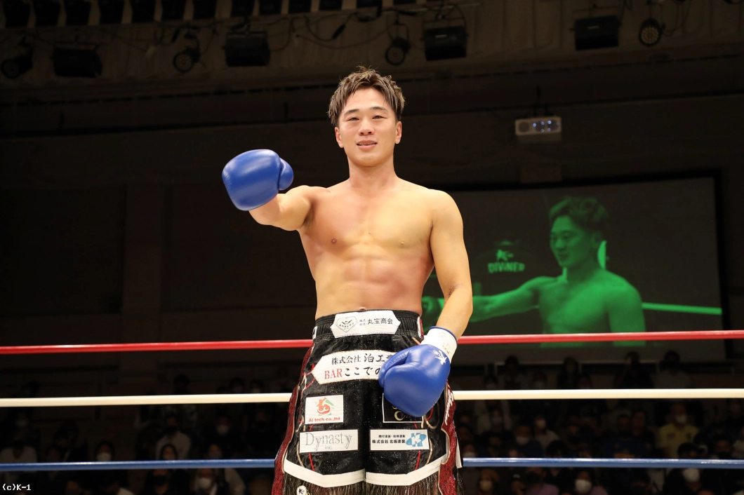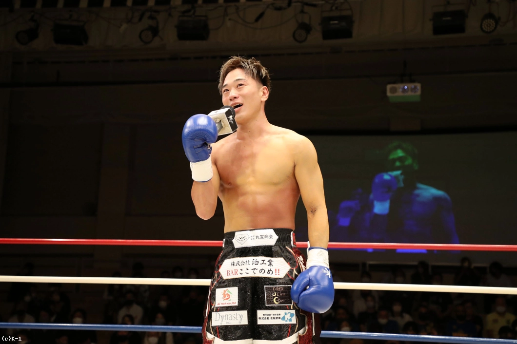 「(試合を振り返って)今回もKOで勝ててよかったです。勝った試合4つともKO勝ちなんで、12月のK-1大阪大会で使ってください。(相手の印象は?)試合前から僕のことを褒めてくれて、いい人と思っていたんですけど、試合後も気持ちよく話してくれたんで、いい人のままでした。(対策は?)僕自身は試合を見ると気持ちが入りすぎちゃうんで(相手の試合は)1試合も見てなくて、トレーナーの人に見てもらいました。トレーナーからは左フックが当たると言われていて、その通りやったかなと思います。
