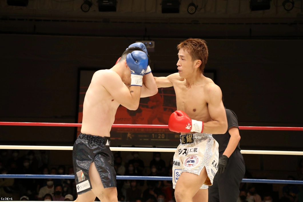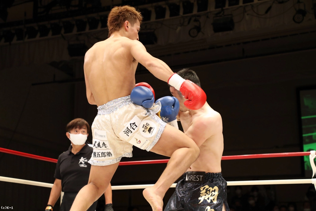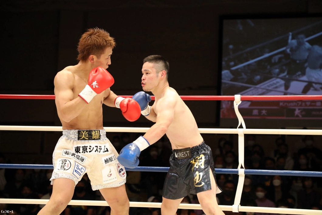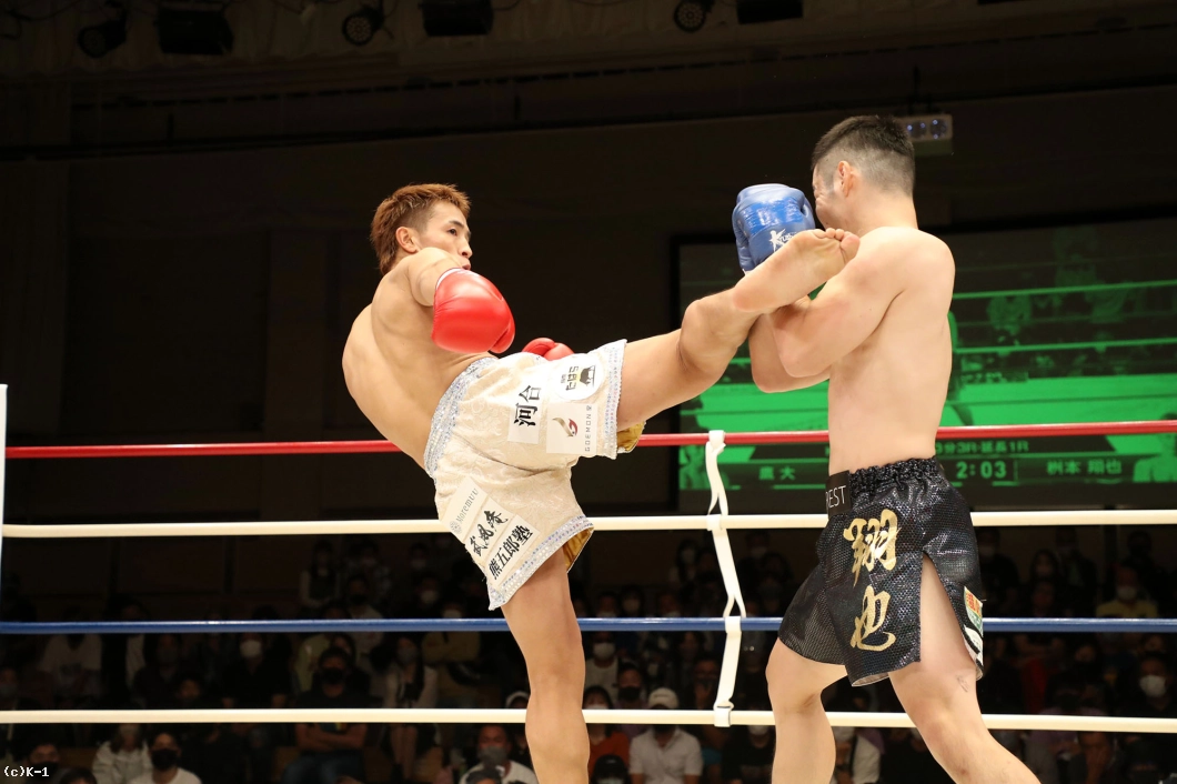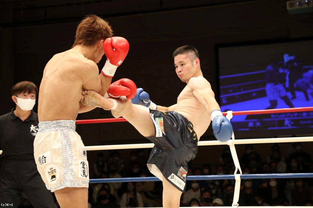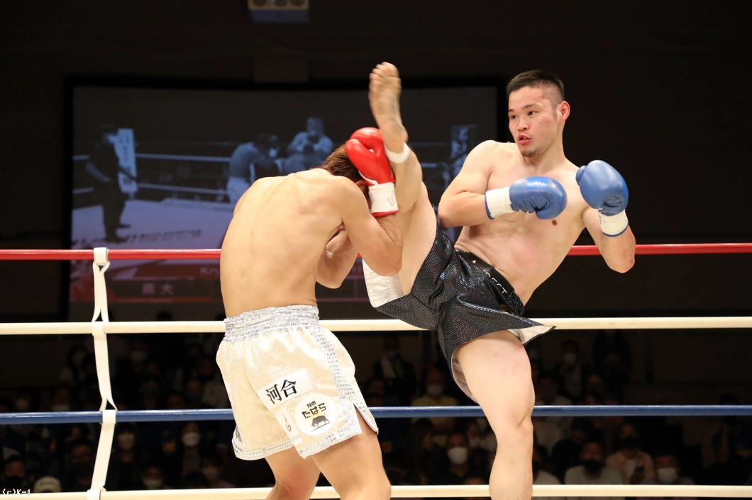 3R、鷹大が前蹴りとジャブ、左ミドルで桝本を間合いに入らせない。桝本が詰めても鷹大はフックを入れつつサイドにかわす。桝本はしかし前進を止めずボディフックで鷹大を削る。鷹大はしかし左フックを当て、桝本を足払いで転倒させる。判定は29-29、29-28、30-29の2-0で鷹大。桝本にパワーと圧力を発揮させず勝利した。