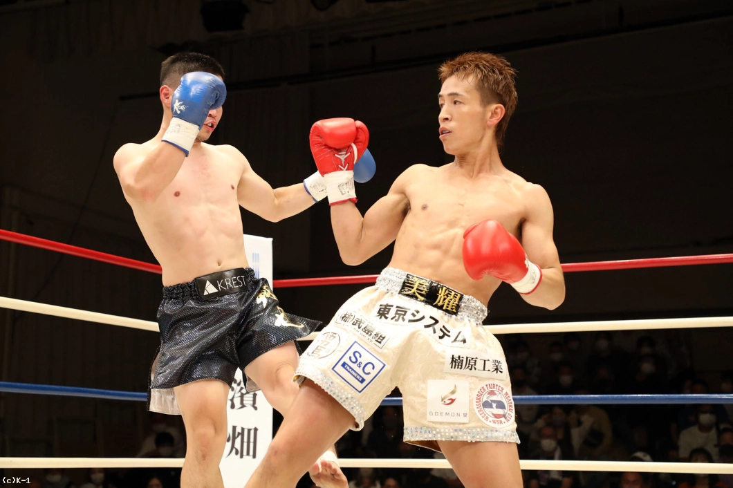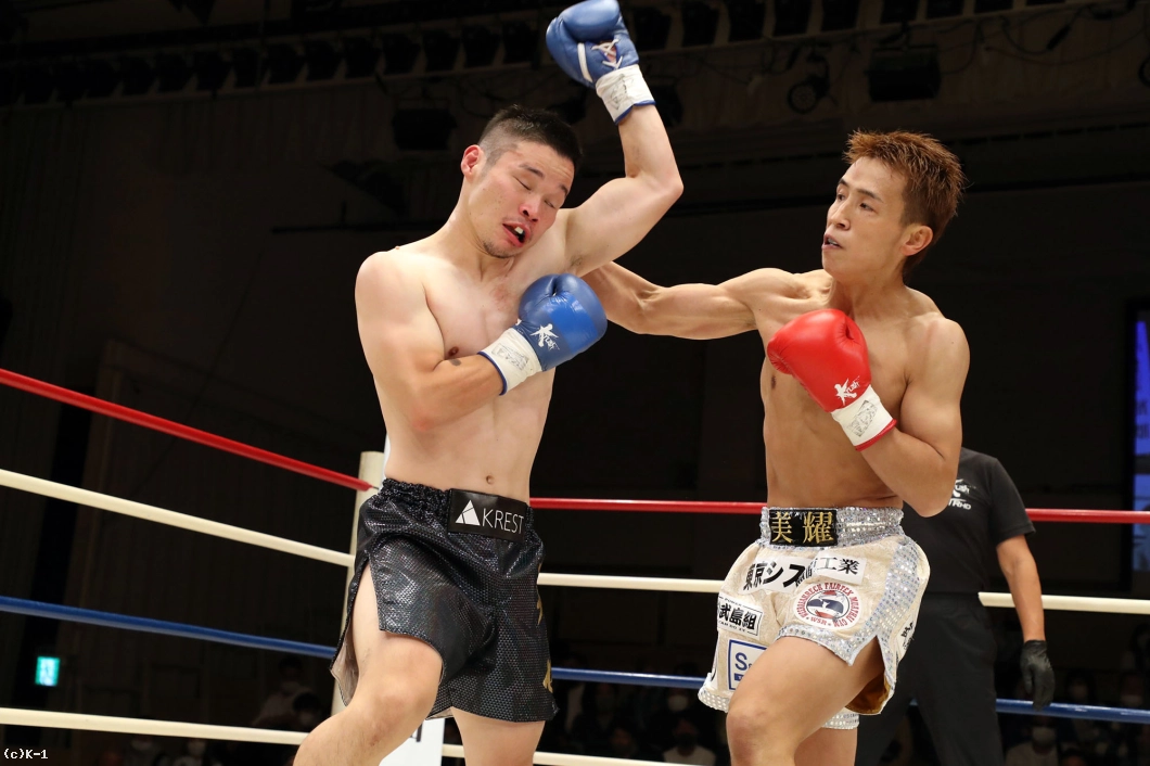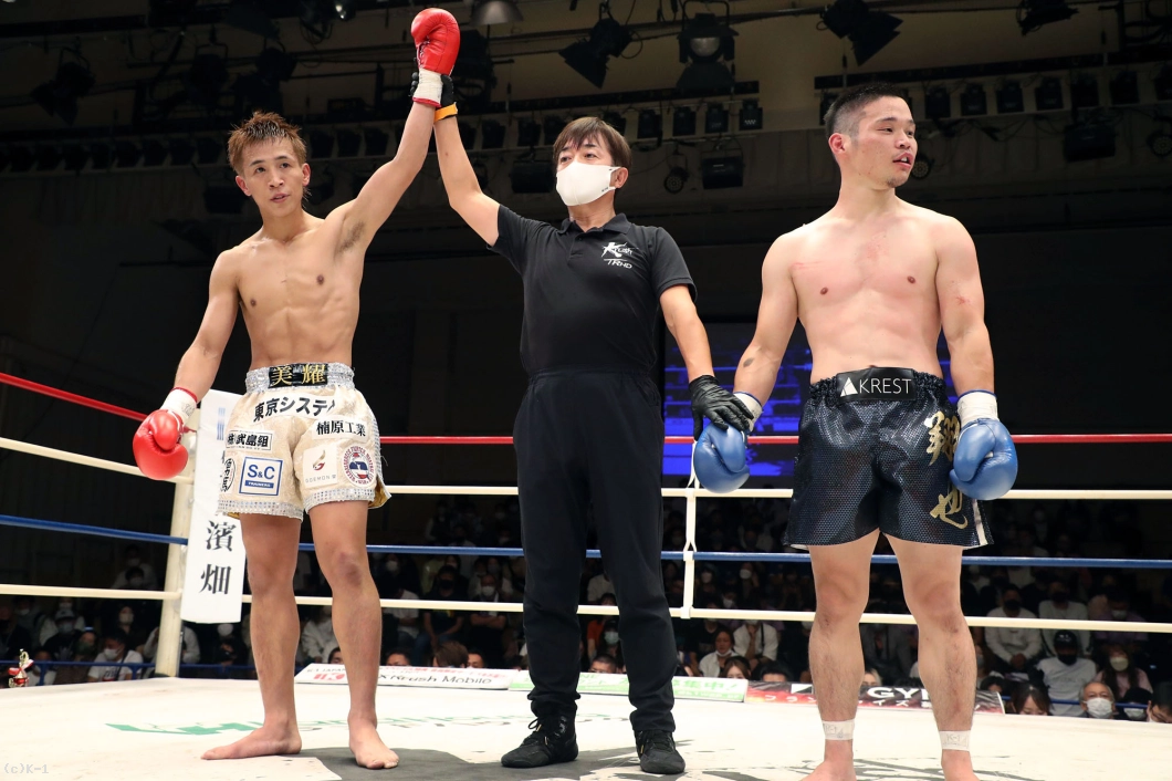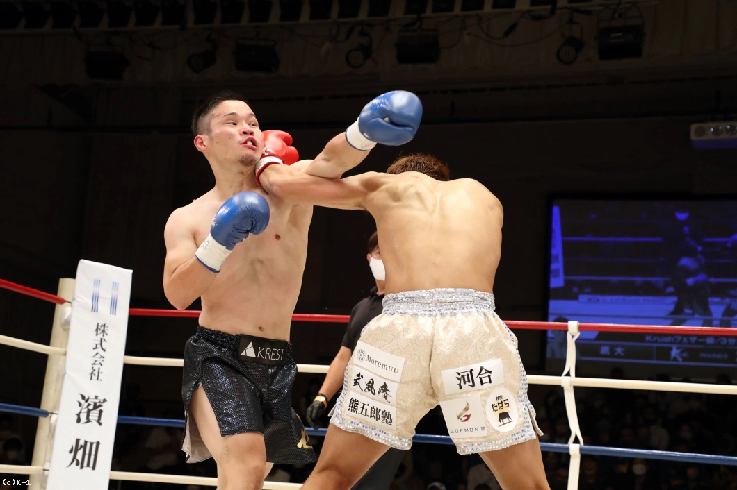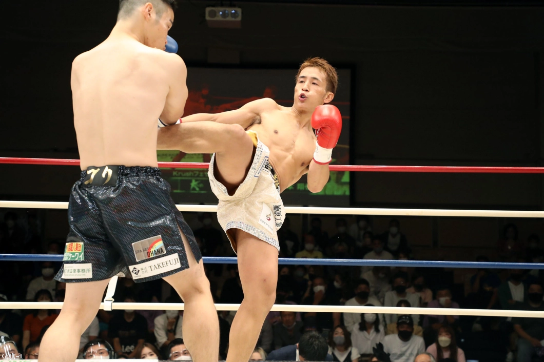3R、鷹大が前蹴りとジャブ、左ミドルで桝本を間合いに入らせない。桝本が詰めても鷹大はフックを入れつつサイドにかわす。桝本はしかし前進を止めずボディフックで鷹大を削る。鷹大はしかし左フックを当て、桝本を足払いで転倒させる。判定は29-29、29-28、30-29の2-0で鷹大。桝本にパワーと圧力を発揮させず勝利した。