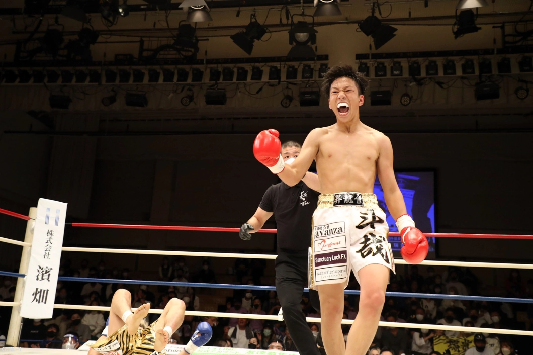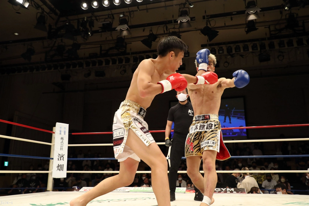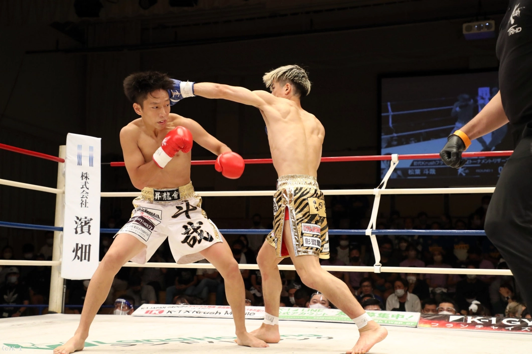 2R、瑞貴は松葉をロープに詰めて左ストレートと右フックで攻める。だが松葉はクリーンヒットを与えずに押し戻し、前蹴りで瑞貴のバランスを崩す。距離を詰めてのパンチを狙う瑞貴だが、松葉はガードしてステップで回り正面で打ち合わない。