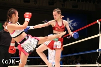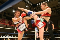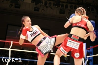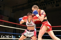 3R、MOEはより距離を詰めるようになり、左右のフックでケイトを襲う。ケイトはこれを組んで押さえてしまいレフェリーから警告を受ける。ミドル、飛びヒザと蹴り主体のケイトに対し、MOEは左右フックを顔とボディに回転させ、右ハイも当てて終える。