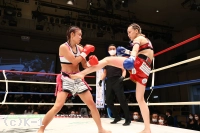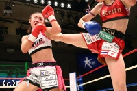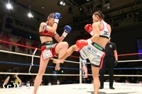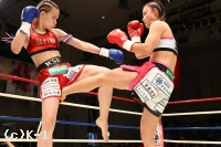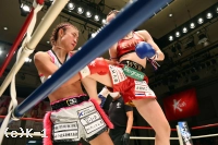 EXR、MOEはケイトに蹴らせまいと前に出て距離を詰める。ケイトはジャブを伸ばしてミドルキックだが、MOEは左右のパンチ連打から左ハイキックを連係。しかしこれは当たりが浅い。パンチで行くMOEにケイトはヒザ、距離ができると前蹴りを飛ばす。