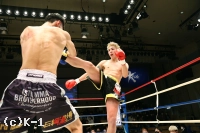 2R、塚本も前に出て試合が混戦となってくる。接近戦で塚本がヒザを入れると、松岡も押し返す。だが塚本は不格好ながらも前進し松岡の距離を潰して蹴りを出させない。松岡は掴みの反則で警告、イエローカードがが出される。