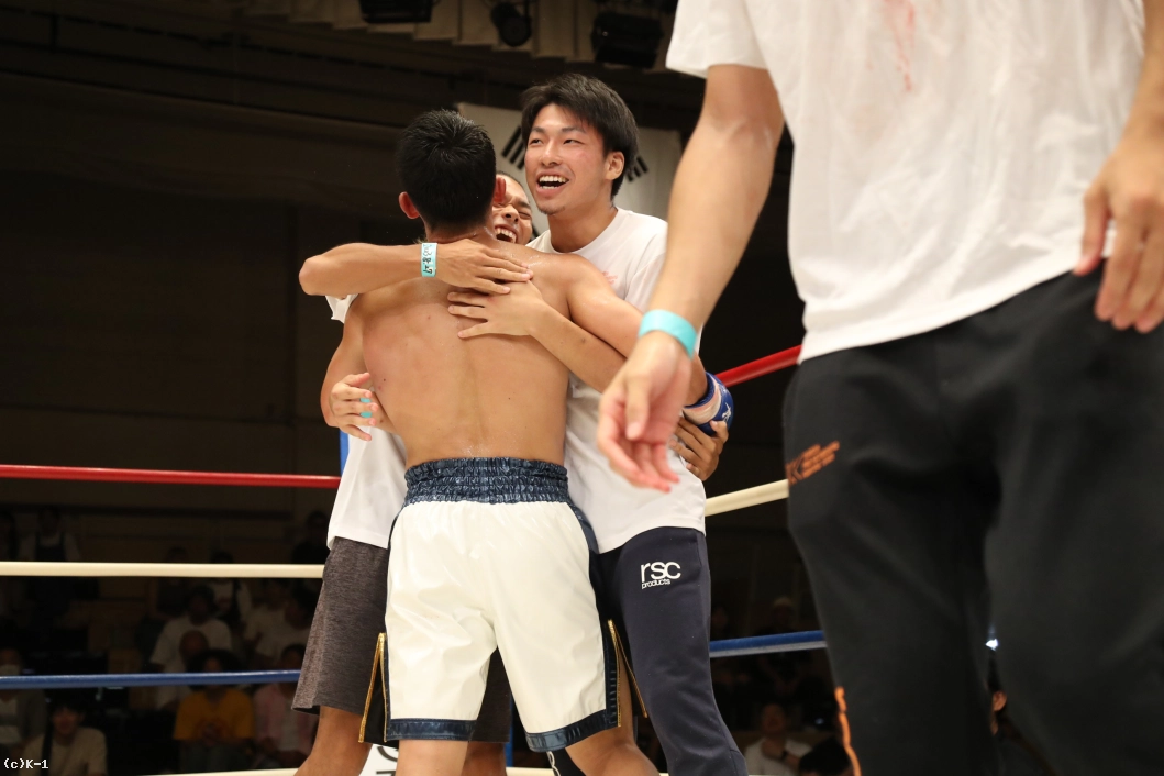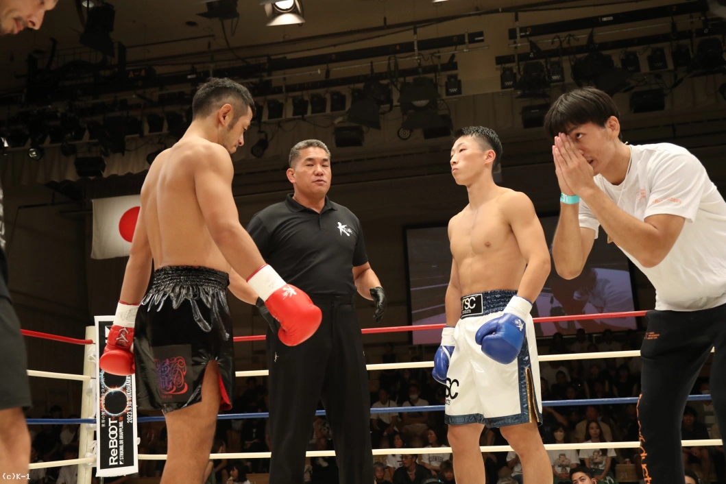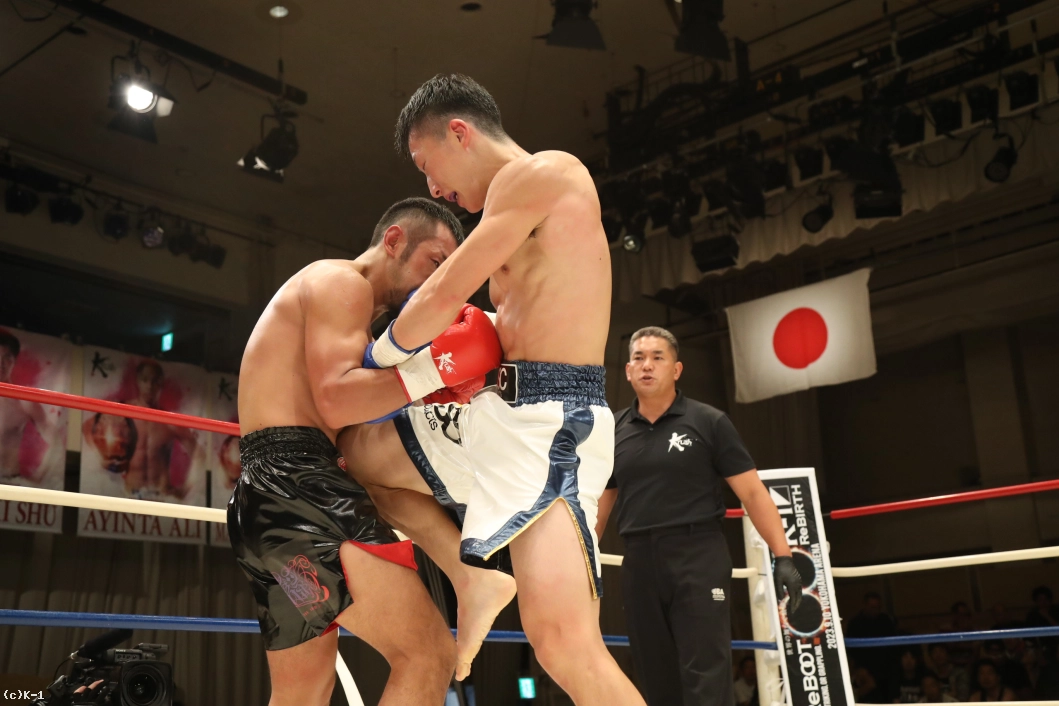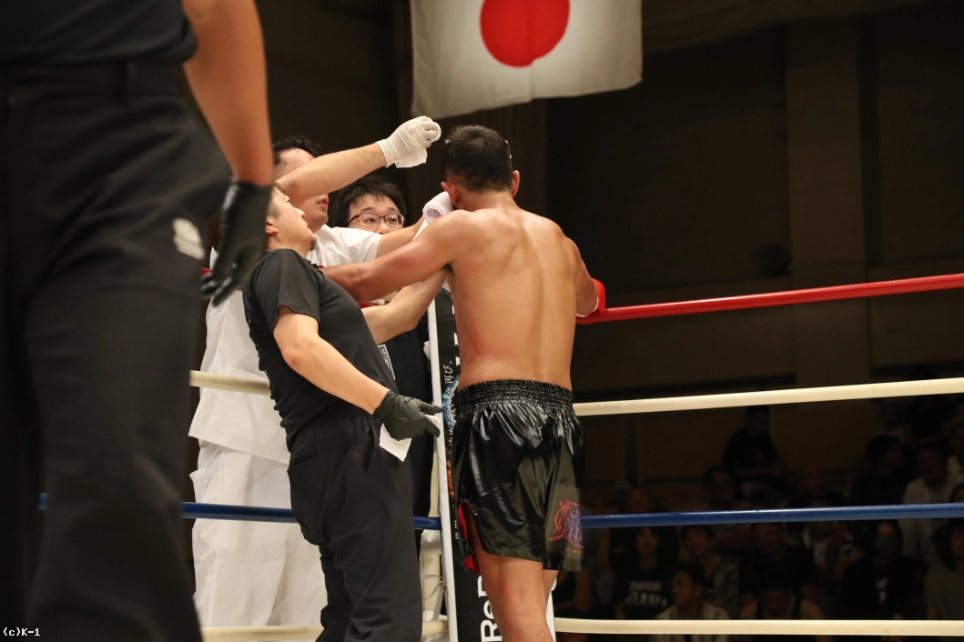 3R、小田が左胴回し回転蹴りを山崎の頭部にヒットさせると、山崎は左額上の生え際をカット。再開後は山崎が頭をつけるように距離を詰め、左右フックを強打する。ブレイクから再開直後に放った山崎右バックスピンキックがローブローとなり一時中断するが再開。小田が左右ストレートを連だし、山崎も至近距離のアッパーで迎え撃つが、山崎の入り際に小田が右飛びヒザ蹴りをヒット。山崎がヒザから崩れ落ちるとセコンドからタオルが投入された。
