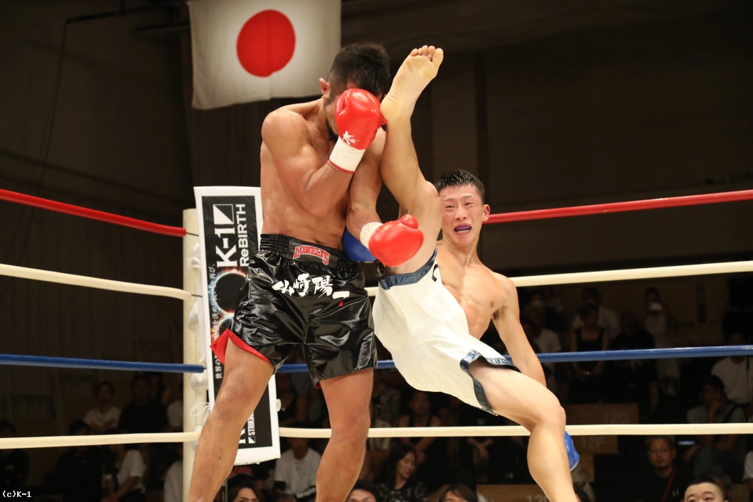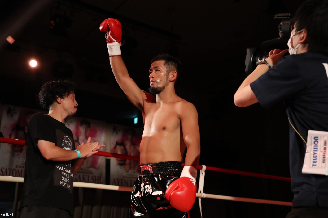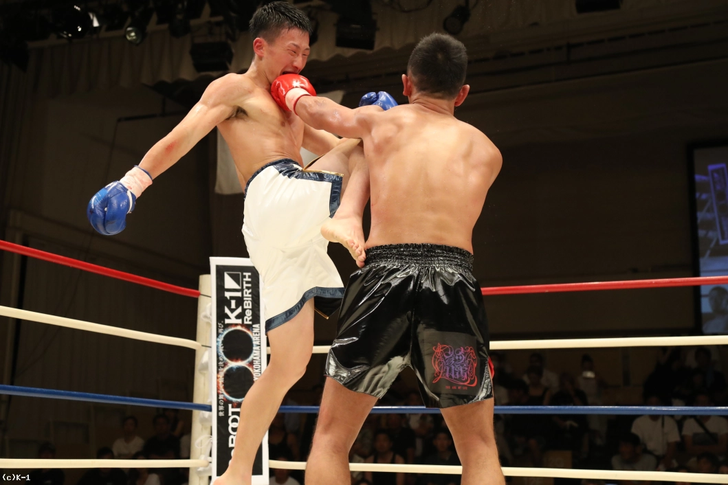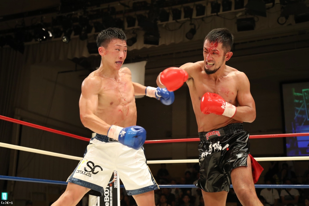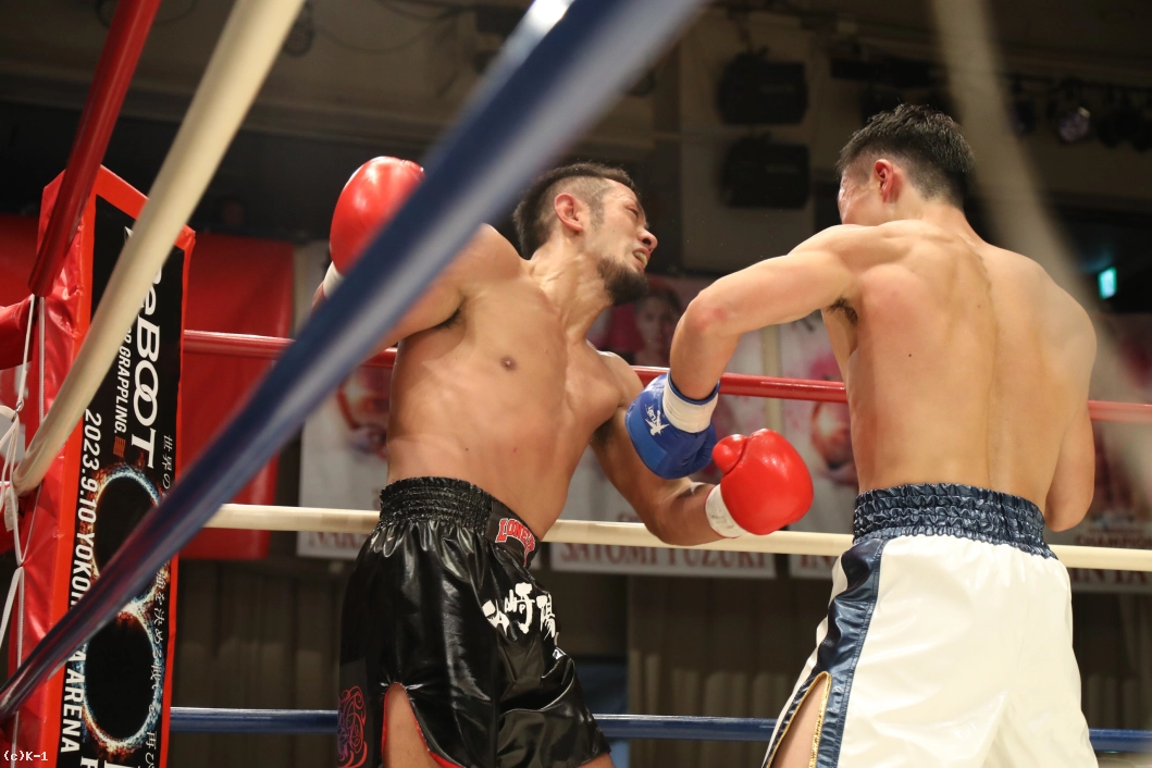 3R、小田が左胴回し回転蹴りを山崎の頭部にヒットさせると、山崎は左額上の生え際をカット。再開後は山崎が頭をつけるように距離を詰め、左右フックを強打する。ブレイクから再開直後に放った山崎右バックスピンキックがローブローとなり一時中断するが再開。小田が左右ストレートを連だし、山崎も至近距離のアッパーで迎え撃つが、山崎の入り際に小田が右飛びヒザ蹴りをヒット。山崎がヒザから崩れ落ちるとセコンドからタオルが投入された。