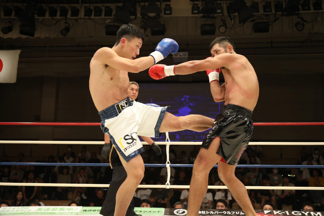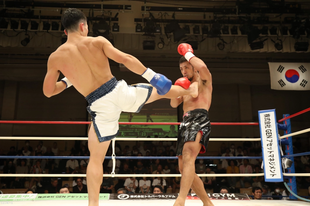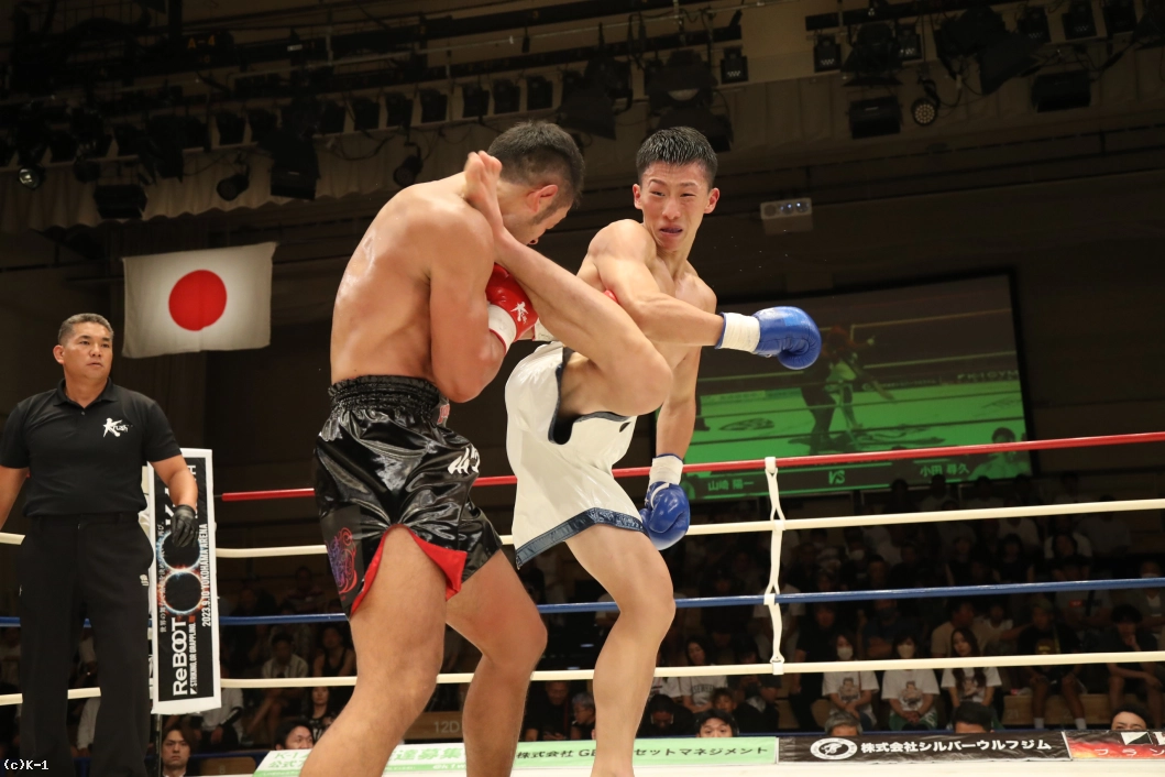 2R、山崎の前進に合わせて小田が右ローを強打。サウスポーにスイッチし左ミドル、左ハイ、右バックスピンキックと蹴り技で攻め立てる。小田が圧力を強めワンツーからロー、ミドル。山崎は懐に呼び込んで右のアッパー、ショートフックと多彩な攻撃。飛び込んで左フックをボディへ叩き込む。