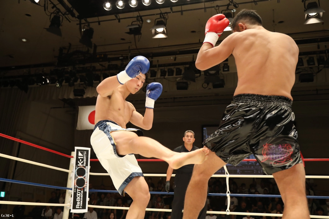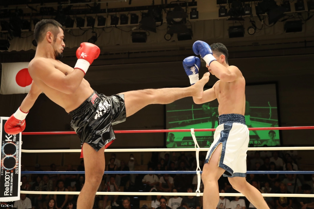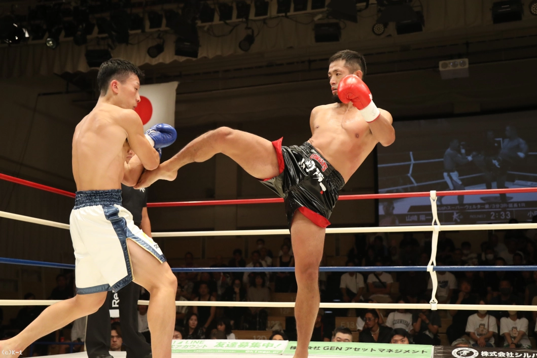 1R、山崎が左インローから右ストレート、左右前蹴りとバリエーション広い攻撃を見せる。小田は横にずれながら左ジャブ、左フック。山崎にロープを背負わせるが、山崎は左フック2連打を引っかけて脱出する。小田はサウスポーへのスイッチを見せ左ハイ。長距離からは右バックスピンキックを顔面に見舞う。