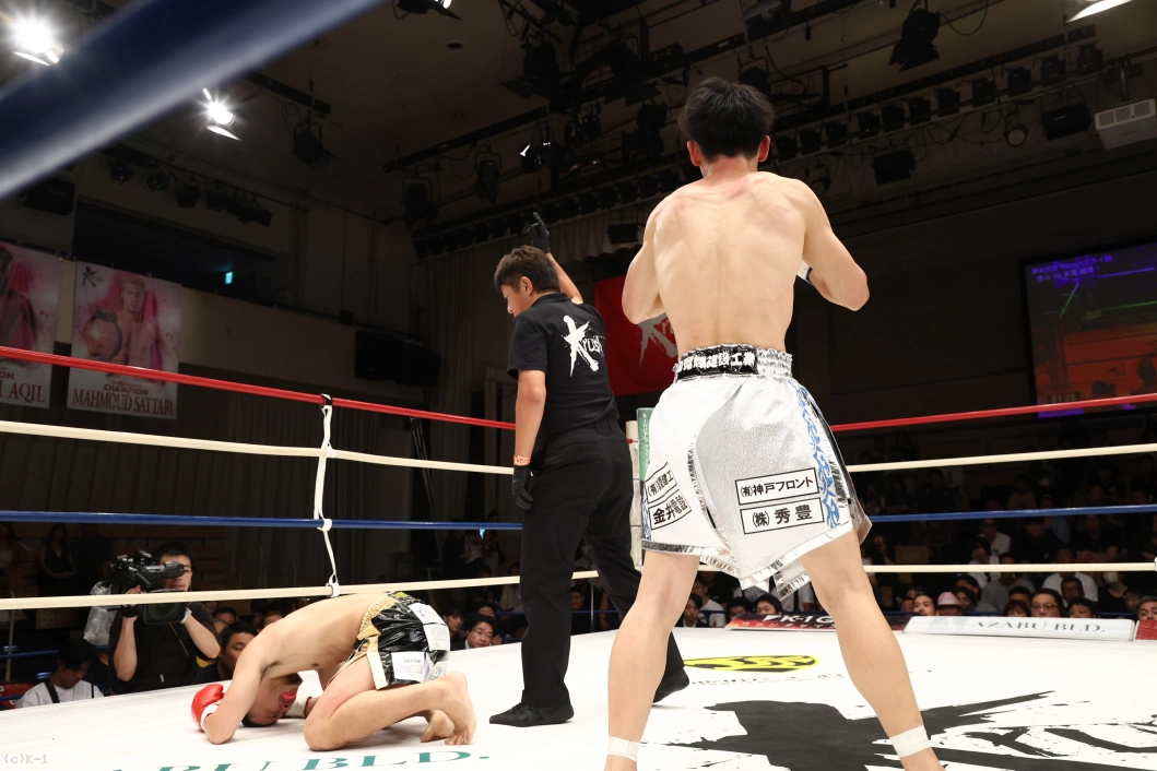 3R、高いガードのまま圧力をかける安尾。悠斗を右ローで転倒させるもローダウン。立ち上がる悠斗はやや足にダメージが見えるか。距離を詰めて左右フック連打を浴びせる安尾。下がる悠斗をワンツーで追い、ガードのすき間に右フックを叩き込む。手数が出なくなった悠斗へ安尾が叩き込んだ左ボディで悠斗がダウン。うずくまり立てない悠斗を見たレフェリーが試合をストップ。安尾が元王者をKOで下し2連勝を飾った。