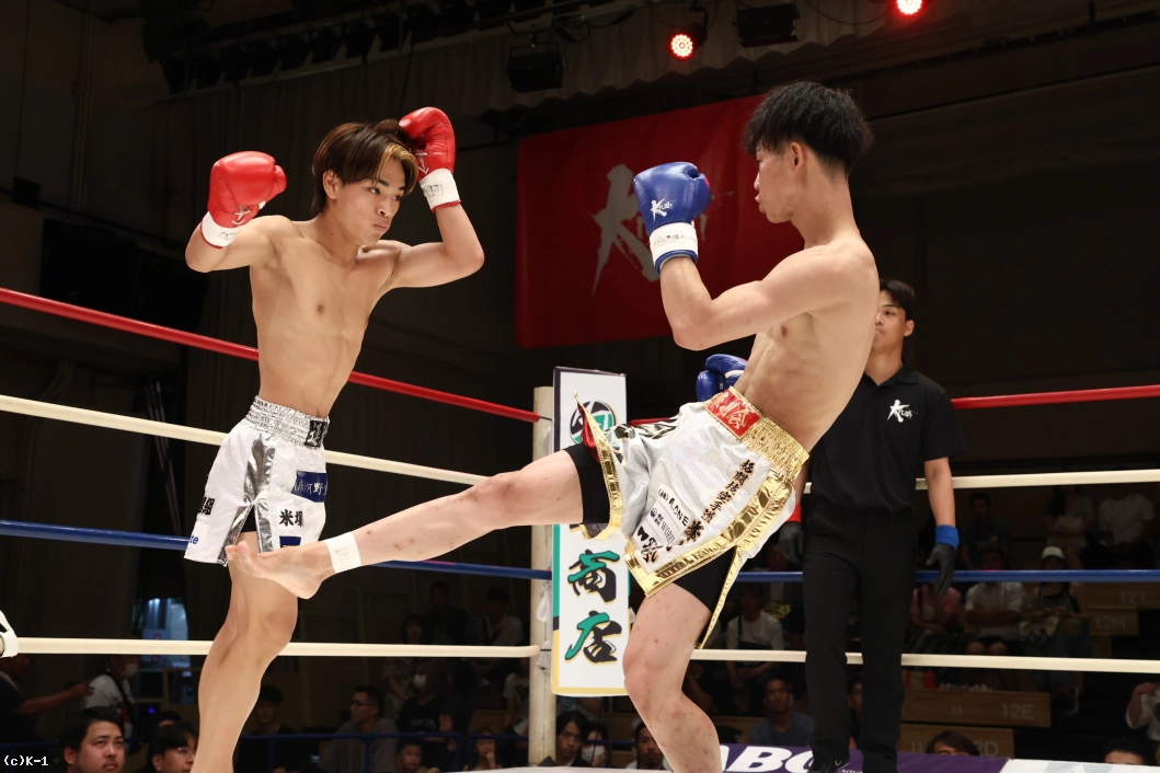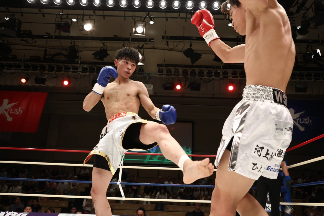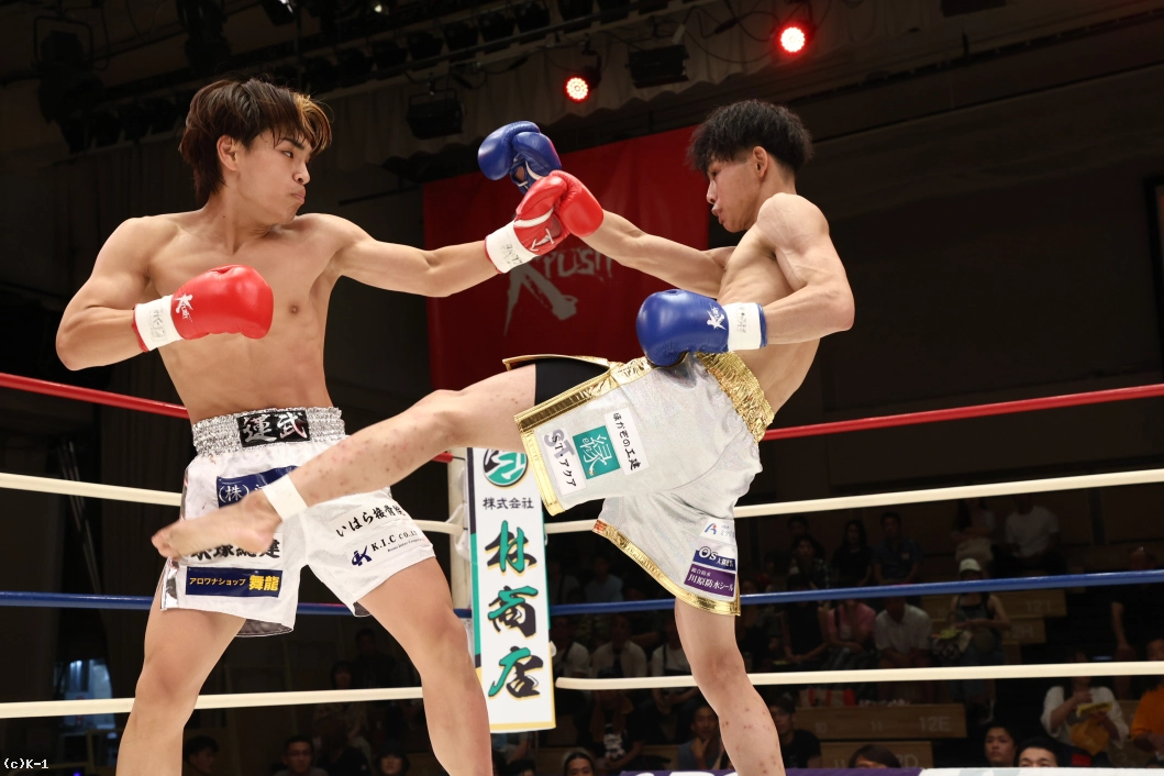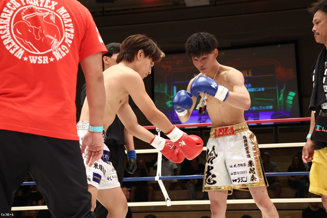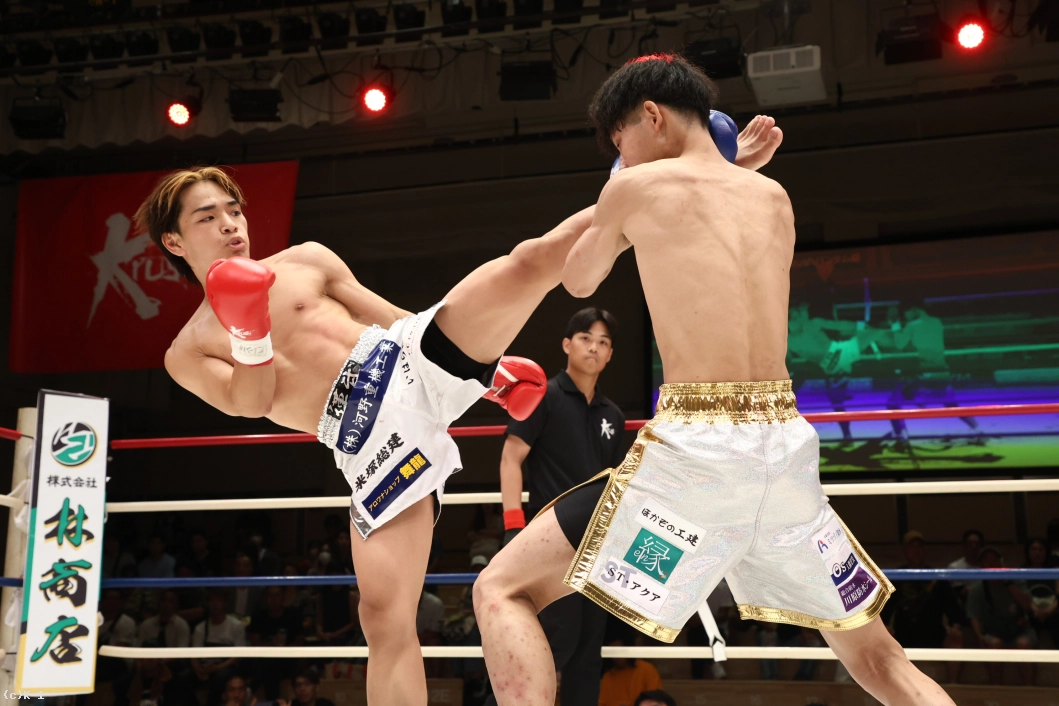 2R、距離を詰める玲志へ小川が右ロー。スイッチを見せる小川へ、玲志は左ジャブから右ミドルで圧力をかける。玲志の打ち終わりに小川が左右パンチ連打から右ロー。玲志の右ローを小川は丁寧にカットし、打ち終わりに左フックを合わせる。