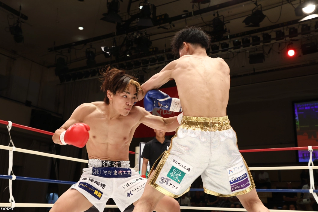 1R、静かな立ち上がりから小川が左右カーフ。玲志も右ローで様子をうかがう。ジリジリと距離を詰める玲志へ小川が左ハイ。さらに踏み込んで右フックをヒットさせる。小川の左フックのタイミングで玲志が手をマットに着くもノーダウン。