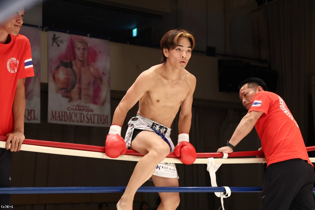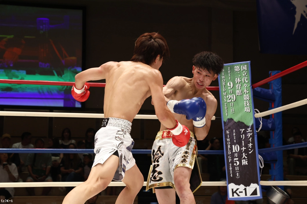 3R、玲志の入り際に左ハイを合わせる小川。ガードを固める玲志を左ボディで攻め立てる。コーナーを背負う玲志の左ジャブに合わせて小川も左ジャブの差し合い。玲志の前蹴りをバックステップでかわし、打ち終わりに小川が左右パンチ連打をまとめてペースを引き寄せゴングを向かえた。