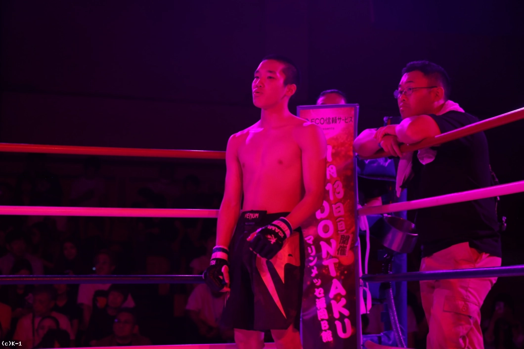 「皆さん、こんばんは! オープフィンガーやるってなって最初から決まっていたんですけど、なかなか相手決まらなくて、対戦してくれた水本選手、ありがとうございます。オープフィンガーめっちゃ楽しかったし、めっちゃ盛り上がっていると思うんですけど、痛いっすね、やっぱ。今回KO勝ちできたのは凄い嬉しいんですけど、僕が目指しているのはちゃんとグローブでフェザー級のベルトを獲ることです。今回はなかなか普通の相手が見つからないんで、オープフィンガーで盛り上げられて良かったです。こっからもっと強くなって、K-1フェザー級のトップに食い込んでいくんで応援よろしくお願いします。もうやりたくないですけど、また相手が決まらず盛り上げたいと思った時にオープフィンガーやるんで、是非また僕の相手をしてください。ありがとうございました」