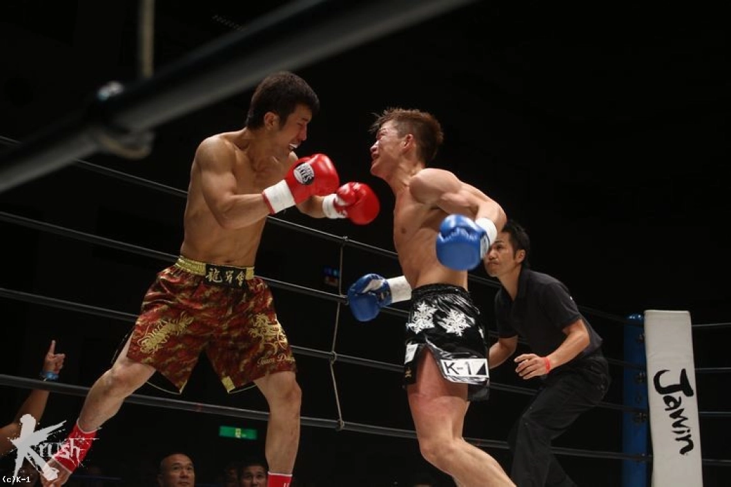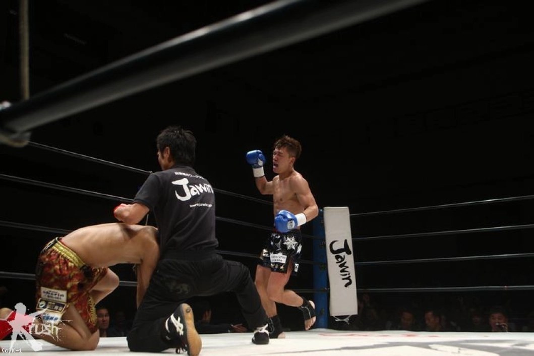 2R開始のゴングと同時にパンチでラッシュする明戸。平塚もガードを固めて右ローを蹴るが、明戸が左フックを効かせて一気に連打。最後は右ストレートを打ち抜いて大逆転KO勝利を収めた。