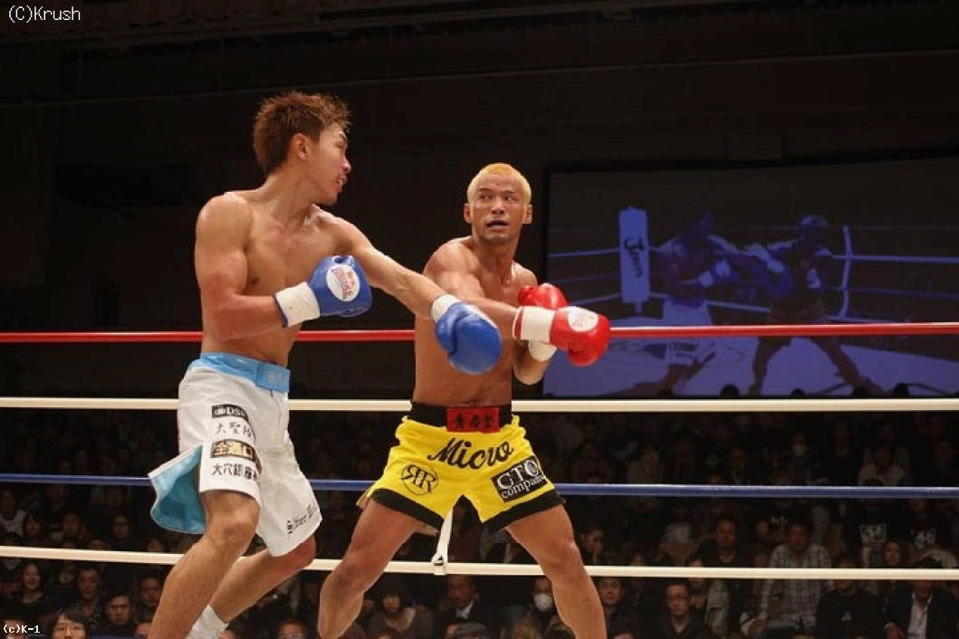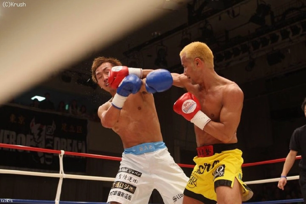 2R、左フックで飛び込むkazyosi。大川は左ミドルを蹴りながら、右フックを狙う。kazyosiは右の蹴りを返して、細かくパンチをまとめる。大川もブロックを固めて右フック。kazyosiは右ボディから右フック、右ストレート。大川はパンチのコンビネーションから左ハイキックにつなげる。