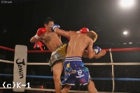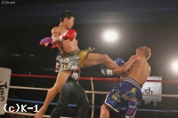 3R、左のパンチで前に出ていく大雅。将大はそこに左フックを狙い、左ミドルに左フックを合わせてダウンを奪う。ポイントでリードを許した大雅だったが左ストレートで猛追。飛びヒザ蹴りの連打、左ストレートと右フックを打ち込む。たまらずクリンチで逃げた将大にレフェリーはイエローカード(減点1)を与える。