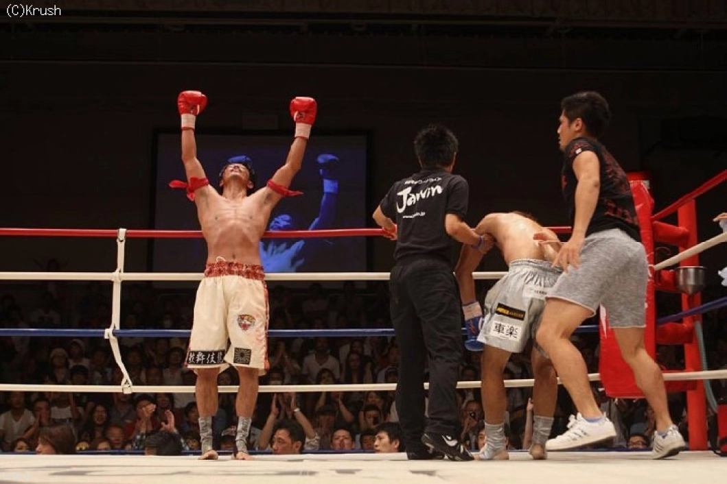 これぞKrushという壮絶な殴り合いは梶原に軍配。試合後は「俺、あと1試合で引退するけど、若手とかこれでいいの? このあと出てくる狂拳もミノルもヒデも半端ねえよ」と興奮気味にまくしてたてると「俺と最後に激闘を望む相手がいたら受けるからよろしく!」とラストファイトで誰の挑戦も受けると宣言した。