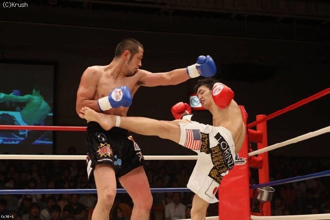 1R、山崎がじりじりとプレッシャーをかけて、ジャブと右ロー。松倉も右ローと左ミドルを蹴り返す。インローで前に出る山崎に対し、松倉は下がりながらミドルを蹴る。山崎はロープを背負った松倉に左ボディを打ち、距離をとった松倉は左ミドルを蹴る。