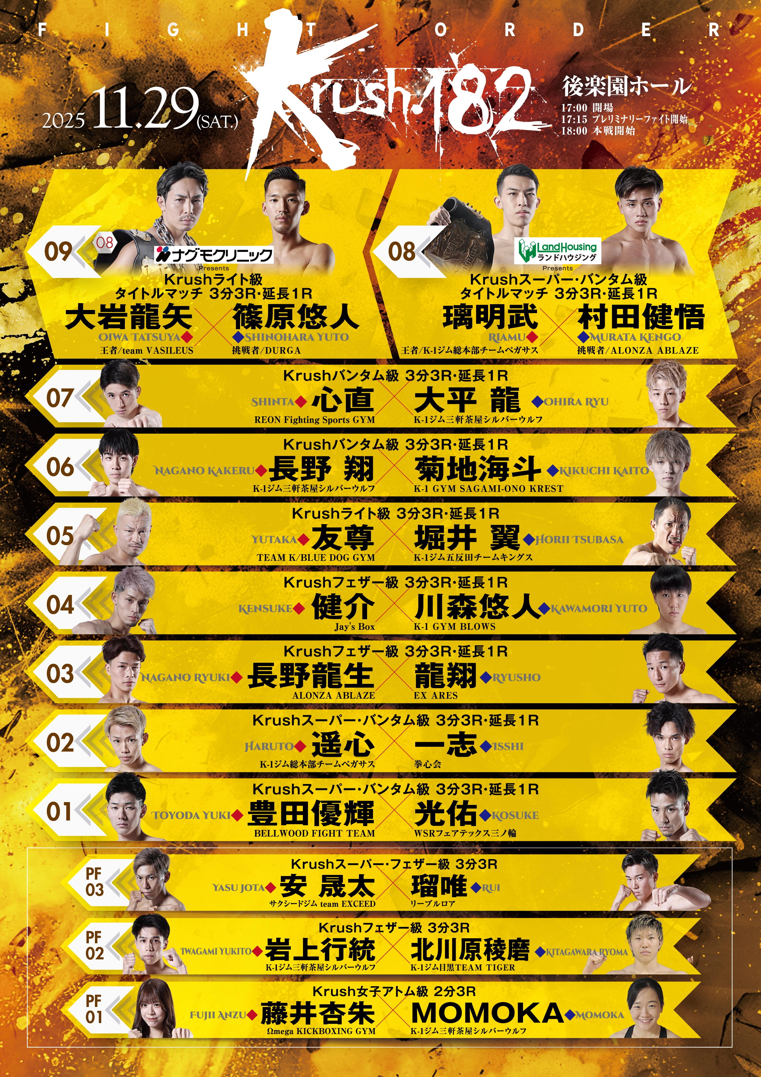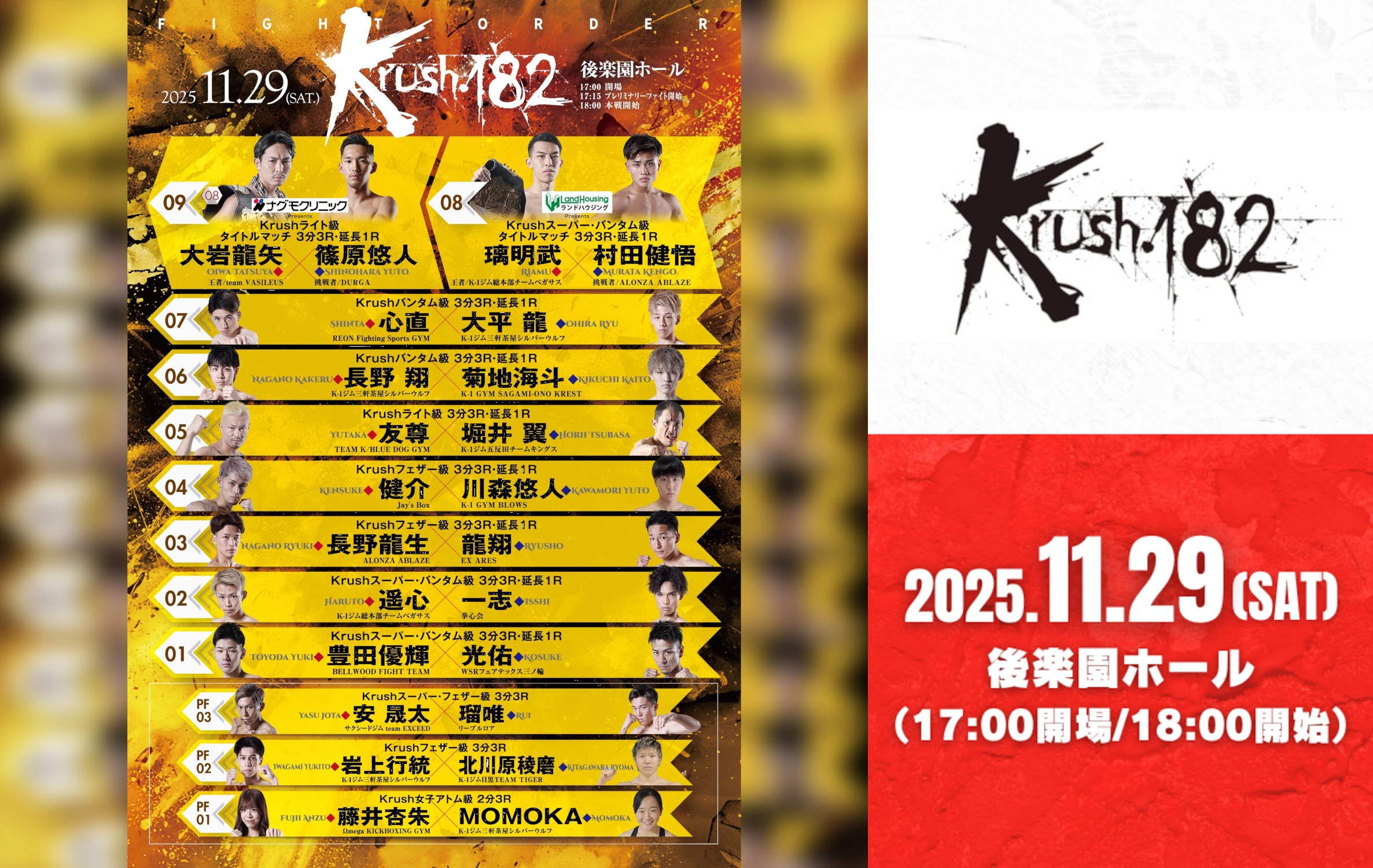 K-1オフィシャルXアカウントにて行ったアンケートの結果、「Krush.182」11.29(土)後楽園ホール大会、ダブルメインイベントの試合順が決定しました。