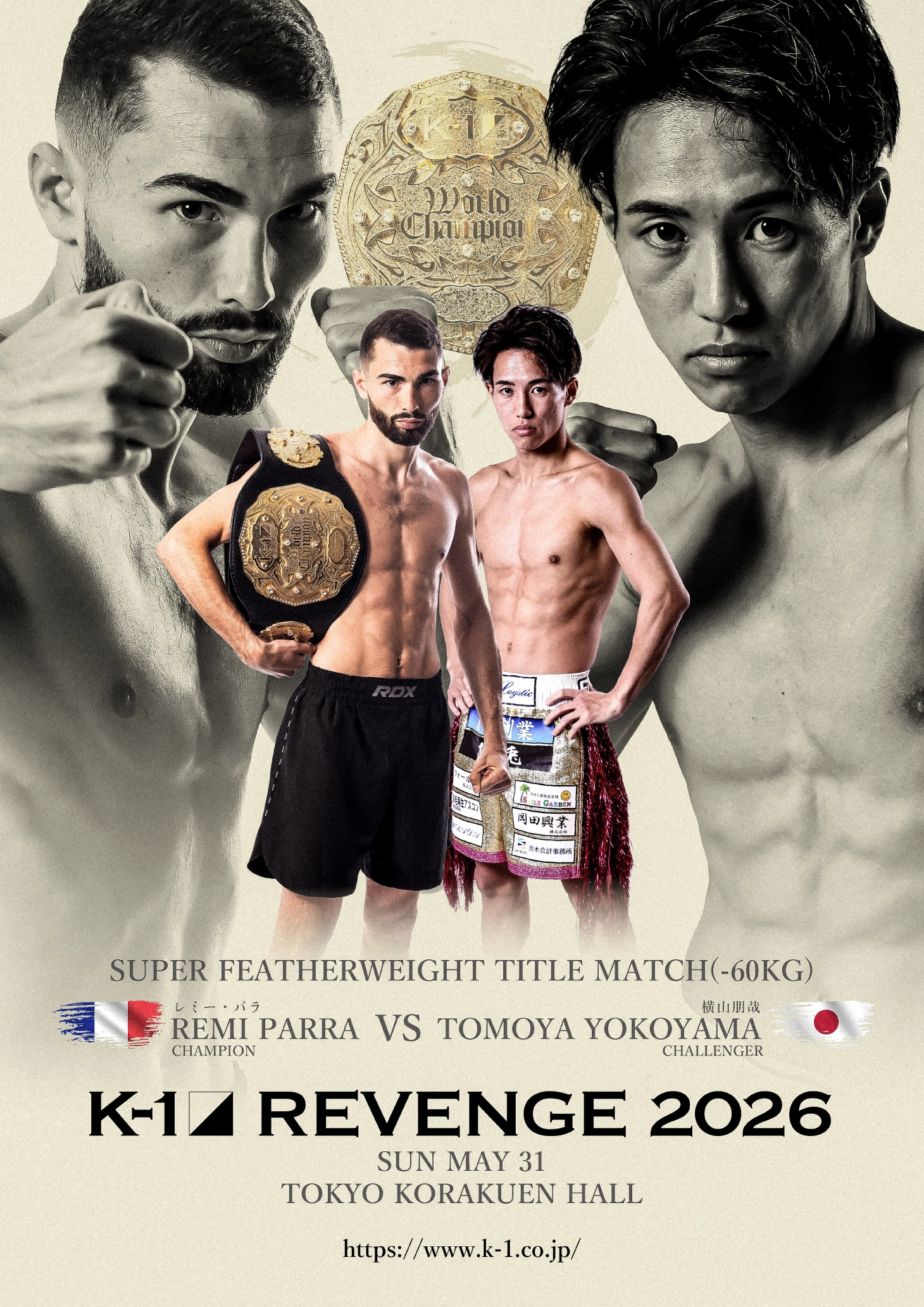 2026年5月31日(日)、東京・後楽園ホールで開催される『K-1 REVENGE』で、“究極の復讐戦”が決定した。[K-1 WORLD GPスーパー・フェザー級タイトルマッチ/3分3R・延長1R]で王者レミー・パラ(王者/フランス/CARCHARIAS)が、ベルトをかけて横山朋哉(挑戦者/日本/リーブルロア)と再戦する。