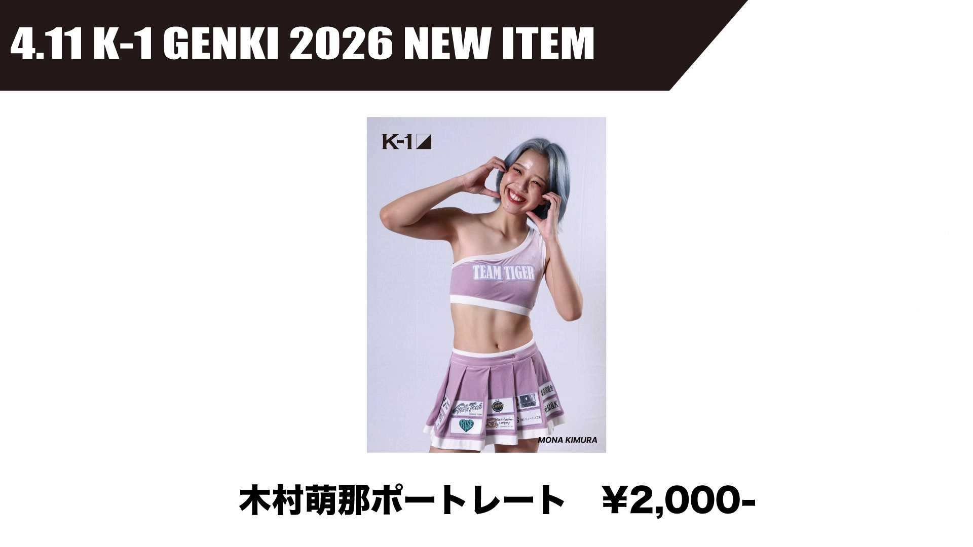 【追加!木村萌那グッズ発売決定!】「K-1 GENKI 2026」4.11(土) 代々木第二体育館 グッズ会場販売情報 2026.04.10 来る、4月11日(土)「K-1 GENKI 2026」代々木競技場第二体育館大会にて、新たに販売するグッズ情報をお知らせします。ぜひ会場物販コーナーにお立ち寄りください!<商品詳細>【木村萌那】ポートレート・価格:2,000円
