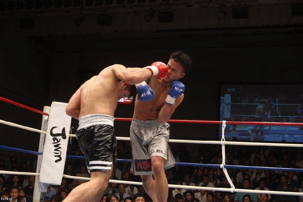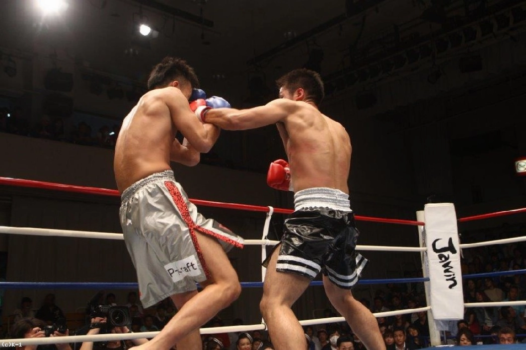 2R、長いリーチを活かし打ち合いを優位に進めた木村だが、ここで杉本が下からかち上げるように右ハイを放って当て、これで木村の長身を倒してダウンさせる。立ち上がる木村だが効いている。杉本は容易に距離を詰めると、左右のフックを振るう。木村はクリンチからヒザを放つももレフェリーからホールディングの注意を受ける。杉本はさらに右ハイ、木村に組まれても左右のボディパンチを連打する。木村はホールディングで再度の注意を受け、レフェリーから警告を発せられる。パンチの打ち合いでは回転のきく杉本が上回り、木村は懐に入られると思わず杉本を掴んでしまう。杉本はパンチだけにならず、右ローを浴びせながら木村に迫る。