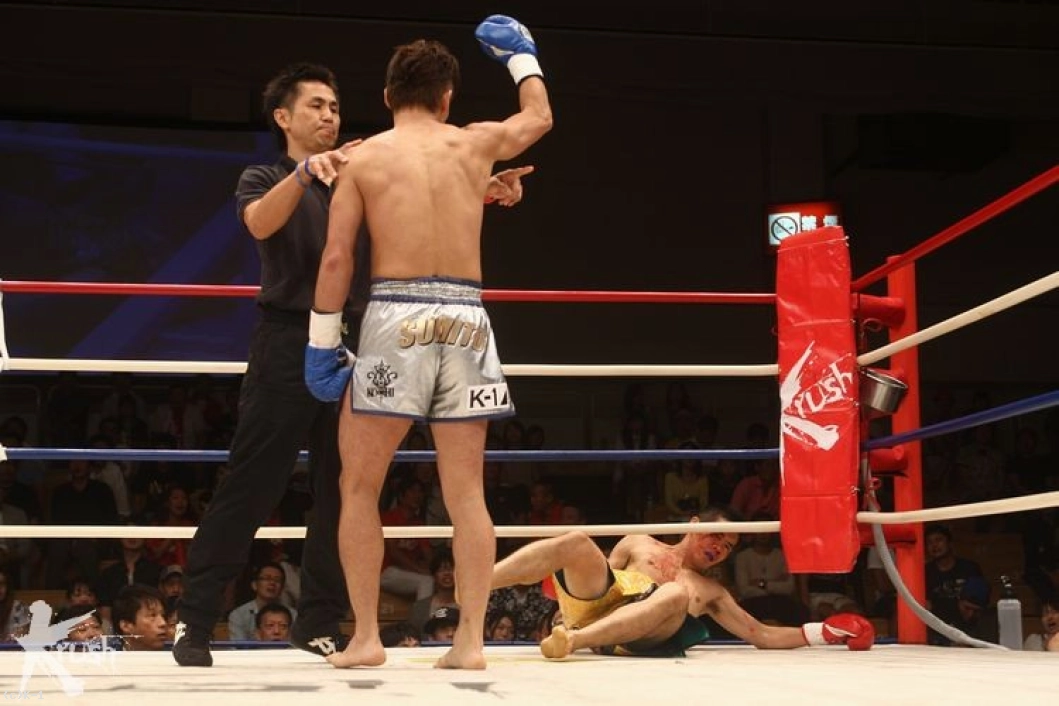 「(念願のKO勝利ですが?)やってる最中、早めに相手が眉上をカットしたんですけど、止まらなかったので、そこを狙って。あとは蹴りが得意な選手だったので、そこだけ警戒して、しっかり返せるように意識しました。(ダウンを奪った攻撃は狙いどおりですか?)まあ、狙いどおりですね。(試合後には涙も見られましたが?)バレましたか? ホントにうれしかったので。この舞台で勝つのは夢だったので。けっこう年もいってるんですけど、まだがんばれるというのを証明できたと思います。(ベルトへの興味は?)欲が出てくれば。やっぱり、一番の僕の目的は小比巻会長のもとで、会員さんたちに格闘技を教えているので、その技術がウソじゃないというのを証明できたので満足です。実戦で見せるのが一番説得力があると思うので、そういうふうにやっていければいいなと思います」