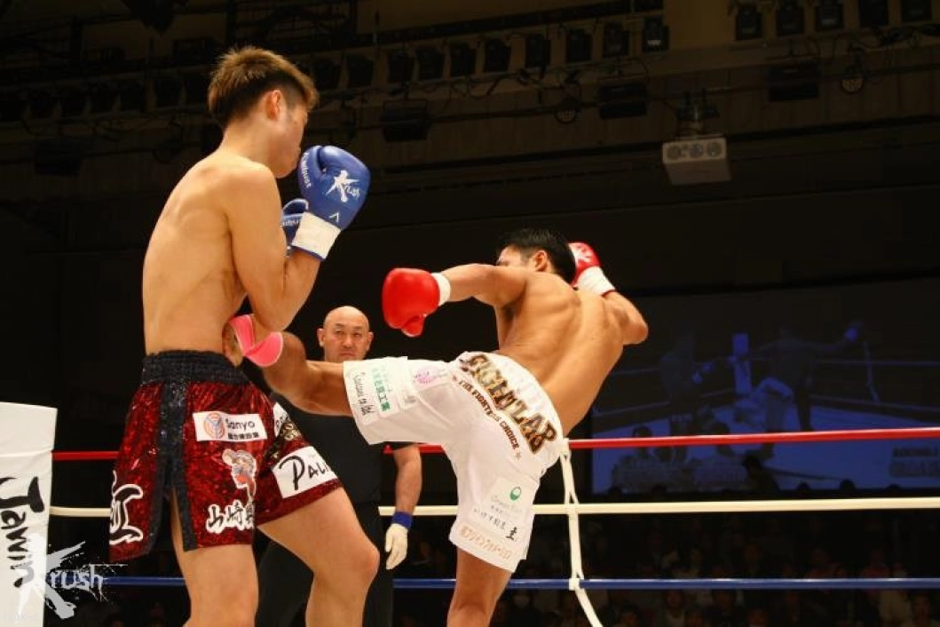2R、腕を思い切り伸ばした左右のフックを放つ稲石だが、安保は見切って当てさせない。これをかわしながら稲石に右ストレート、そして左ハイキックを繰り出して狙う。安保をコーナーに詰めた稲石は上下左右に力を込めたフックを見舞うが、安保は的確にブロックしてダメージを負わない。