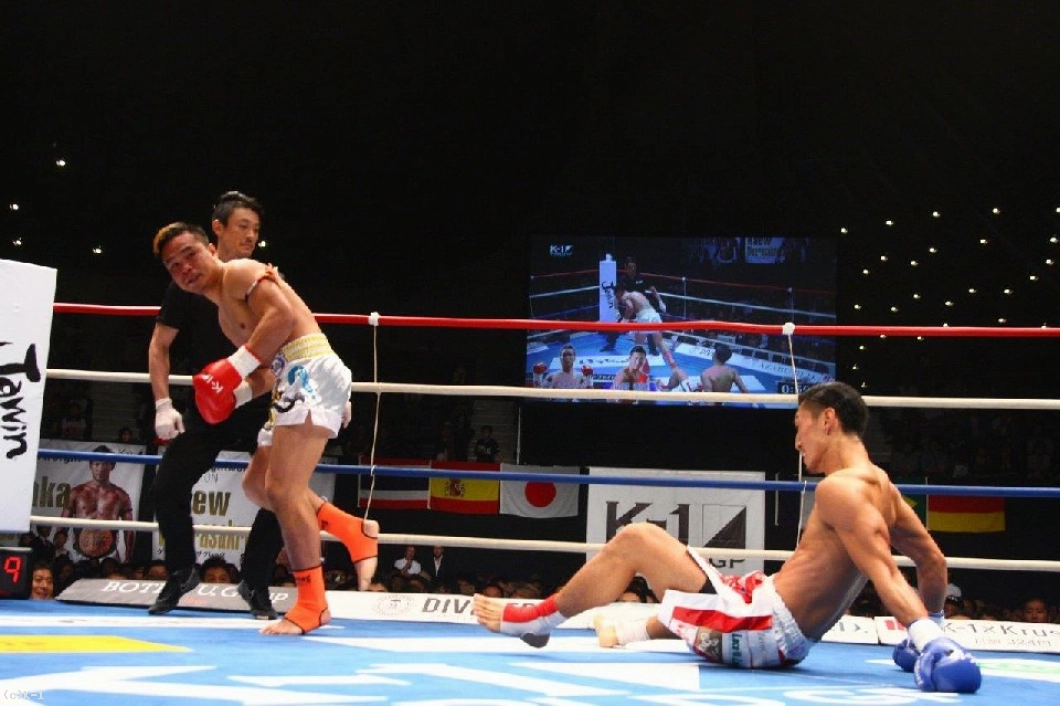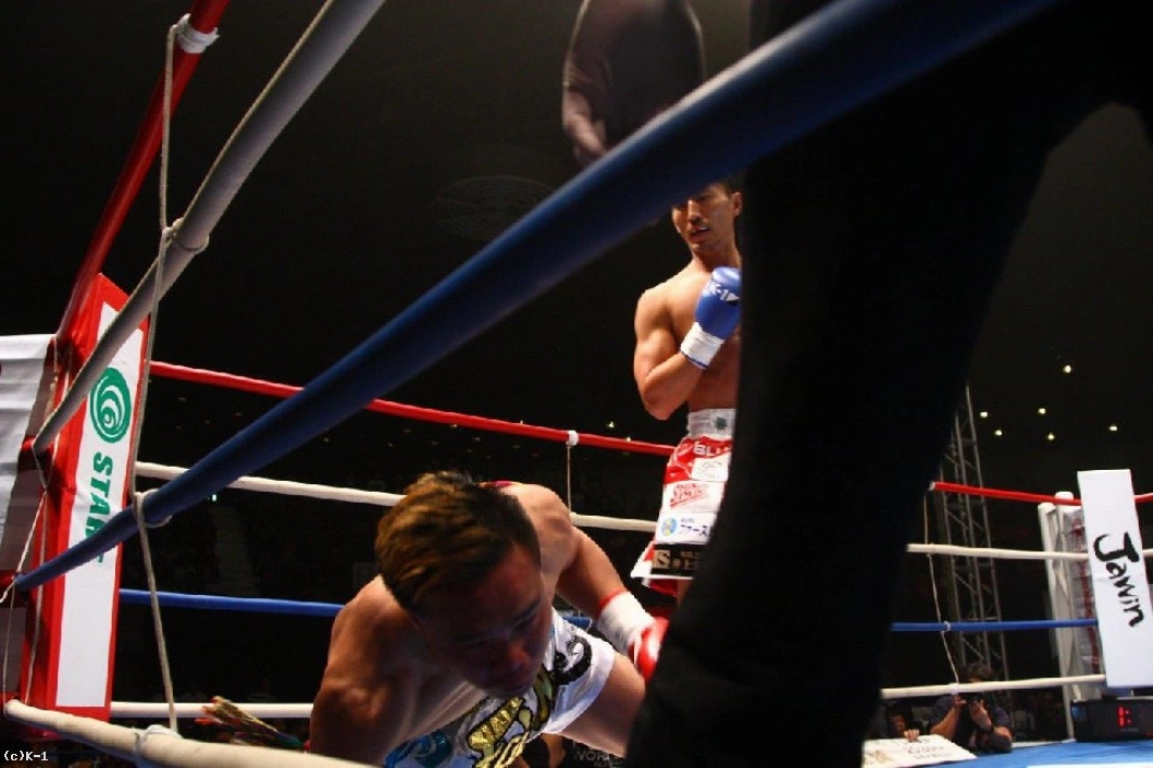 しかし立ち上がったゴンナパーは左インローで山崎の体勢を崩す。ダウンを奪われているゴンナパーだが、山崎のフックに逆にフックを上からかぶせてダウンを奪う。