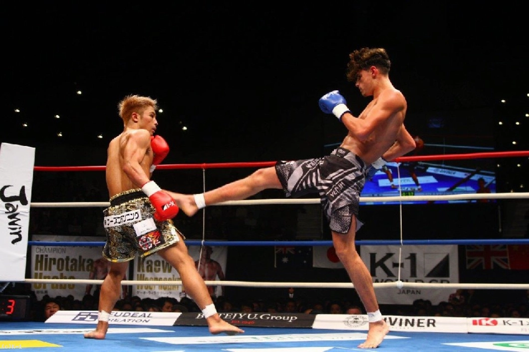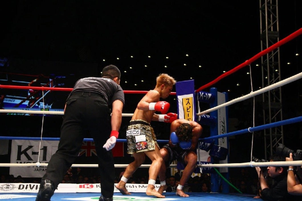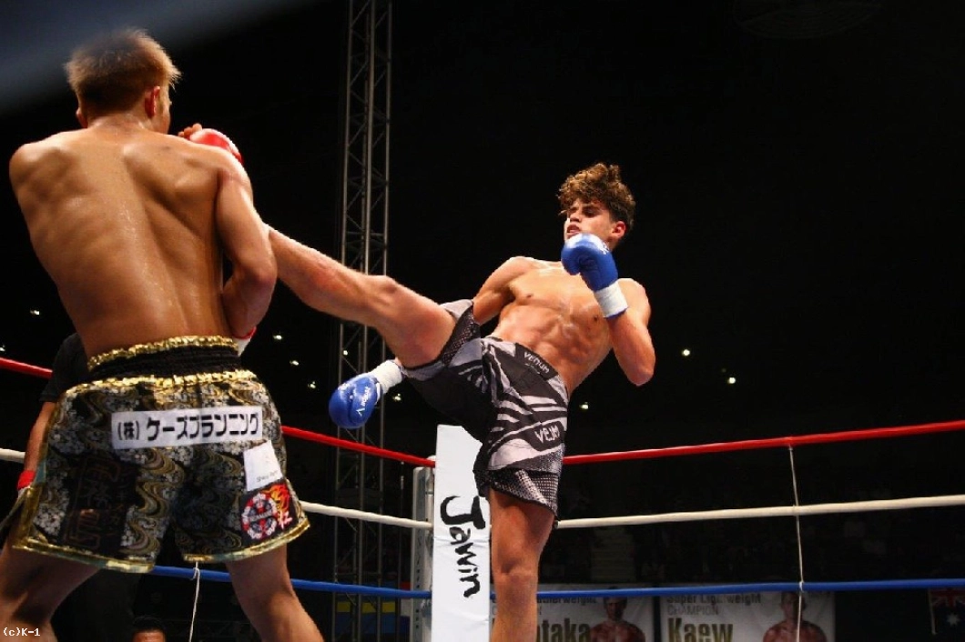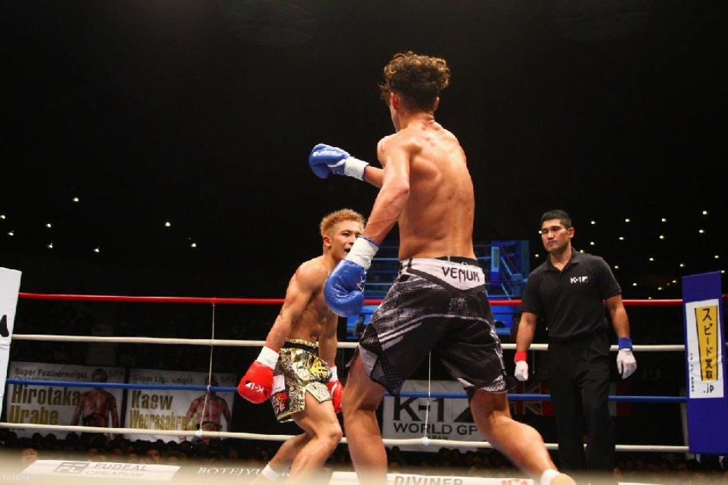 2R、このラウンドもマムーディはサウスポーに構える。そして小澤に対しミドルキック主体の組み立て。懐に入れない小澤はバックブローからパンチをまとめるが、マムーディはこれをブロック。ここで小澤は後ろ回し蹴りを放ち、これがマムーディ脇腹をとらえ、「く」の字になったところをボディブローを連打して小澤がダウンを奪取。小澤は一気に試合を決めんとボディに連打を集めるが、ここはとらえ切れず終了のゴングとなる。