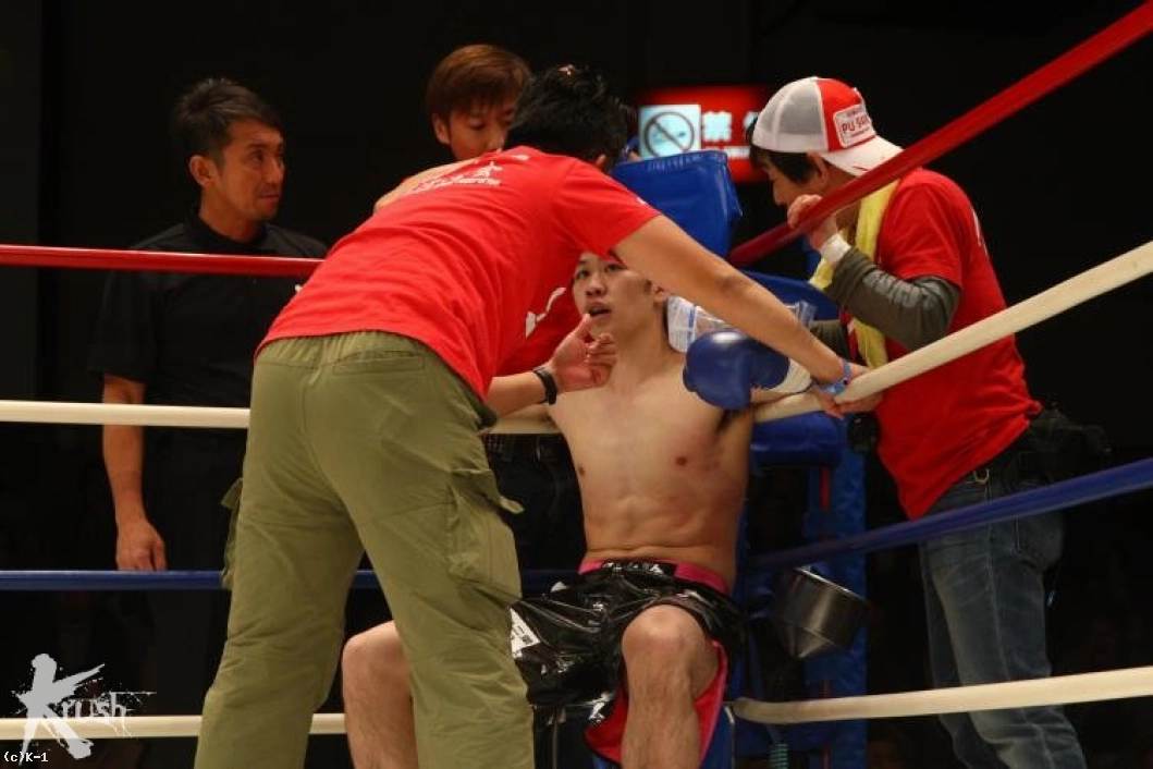 3R、中島は強引に距離を詰めて左右のフックで打ち合いを仕掛ける。しかし和島も左ストレート、右アッパーと打ち返し負けてない。中島はプッシングで和島を押していき、和島はやや口が開く。中島の右ボディアッパーも効果を上げているか。中島は和島を下がらせて跳びヒザ。両者とも失速が見られるが、馬力で勝り押し勝っているのは中島。和島をロープに詰めボディから顔面にパンチを回転して終える。。