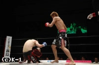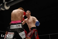 1R、サウスポーの和島は長身とリーチを活かした左ミドルを放ちながら迫る。しかし田中もこれに右フックを返してヒット。和島はしかし変わらずに前進し、左の蹴りをミドル・ローと散らす。和島の左インローに足を持っていかれる田中。続いて和島は左ローを田中の右足へ放っていき、これを連打してダウンを奪う。