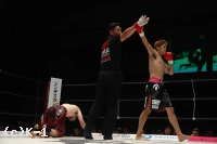 立ち上がって間合いを詰めパンチを狙う田中だが、和島は被弾を許さずさらに左ローでダウンを追加。最後も跳びヒザから入って左ローで3度目のダウンを奪い、田中を初回KOした。