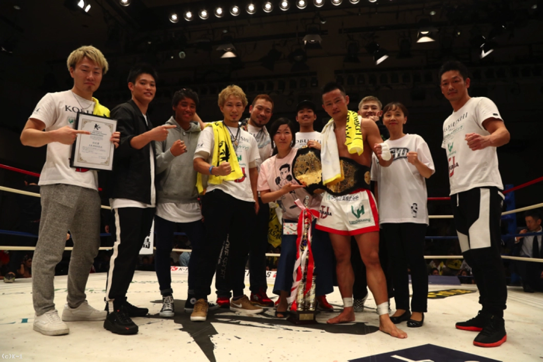私はここで終わりじゃありません。これからも夢を追い続けて頑張ります。みんなも、聞こえない子どもたちも夢に向かった頑張っていけたら嬉しいです。勤め先の社長、社員の方々にサポートして頂いてこのベルトを獲ることができました。中学の時から支えて頂いている社長も本当にありがとうございます。妻のお兄さんも、チーム・ペガサスのみんなも対策を練って頂いて、自分のために本当に感謝しています。たくさんの方々に支えて頂いてありがとうございます。
