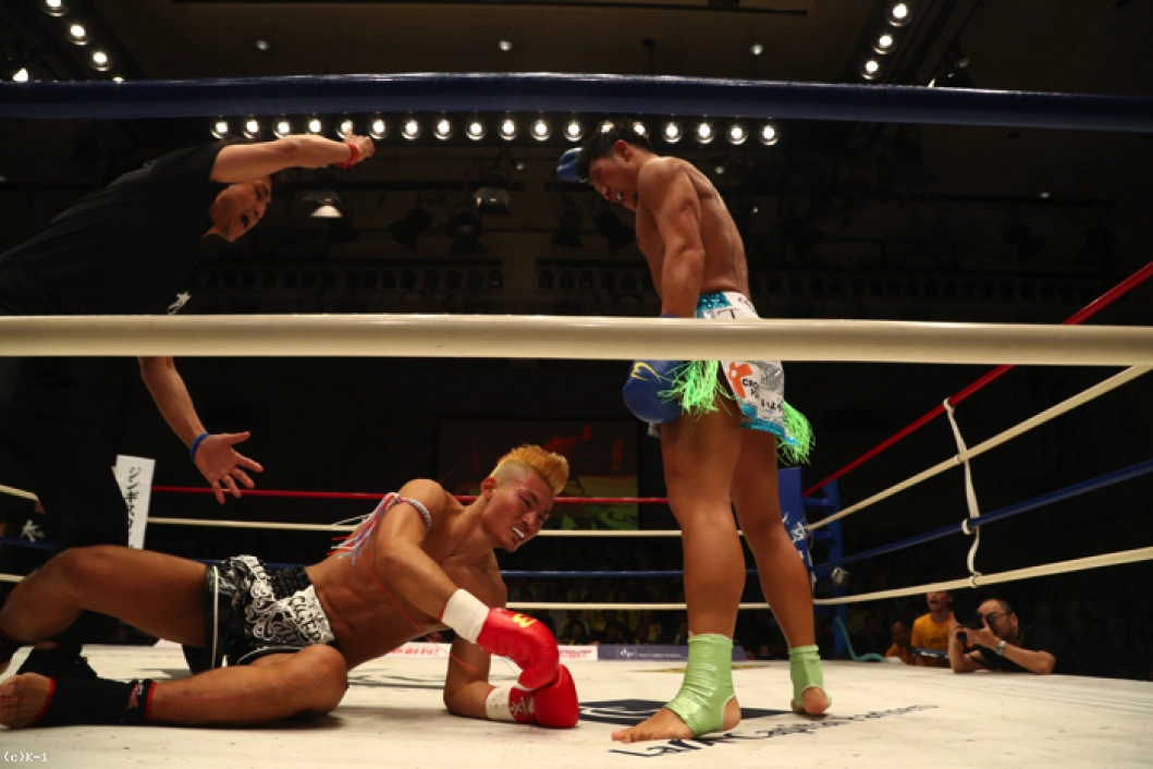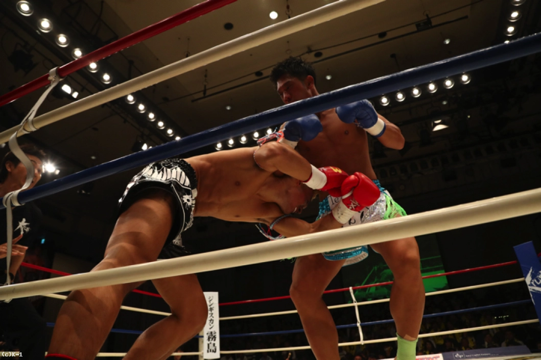 神保は右ジャブに重みを感じさせ、これで小西をとらえていく。さらに神保は終盤左ストレートを決めるが、小西は逆に前へ出ていき、左ストレートから怒涛の連打を仕掛け、ボディへのヒザ、右フック、左ストレートを決めダウンを奪う。神保はダメージが感じられたが立ち上がり、1R終了となる。