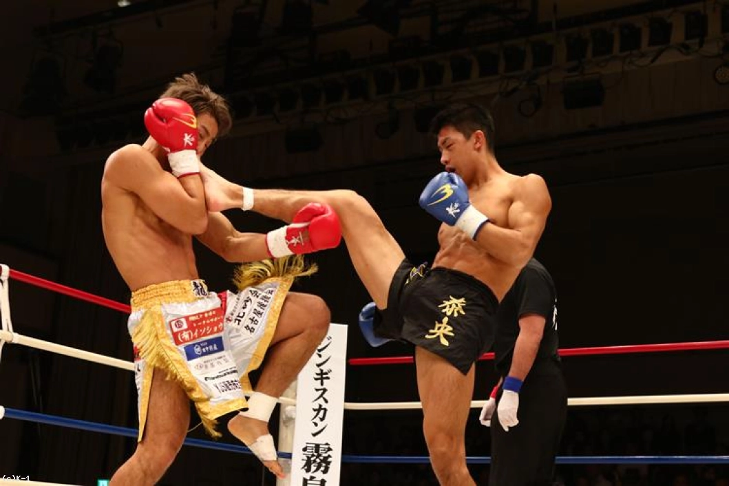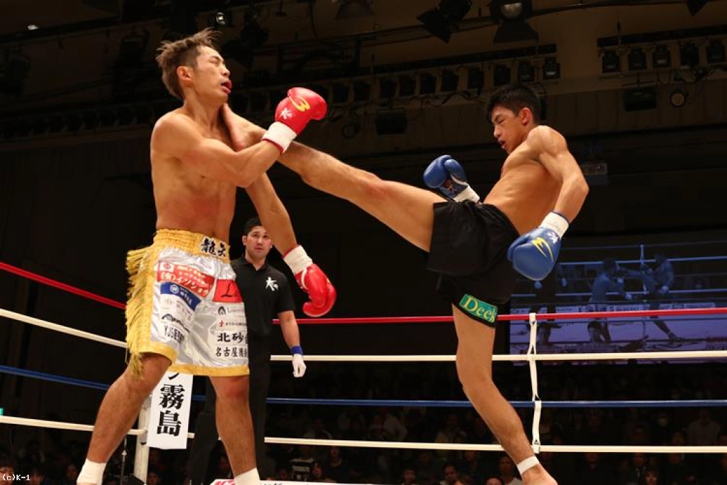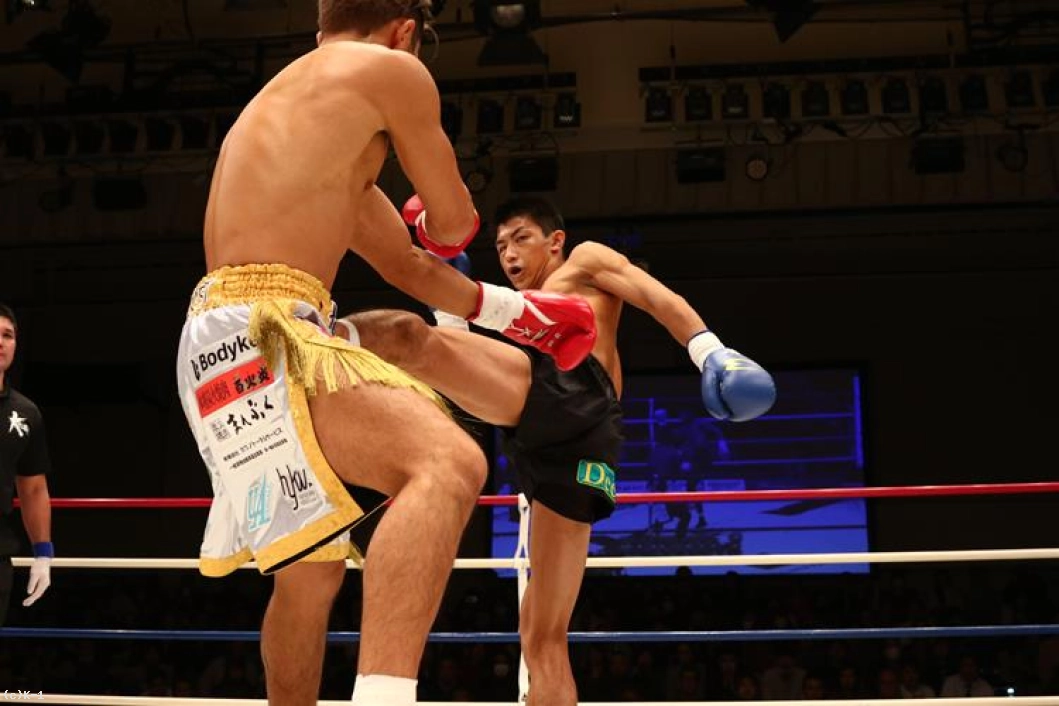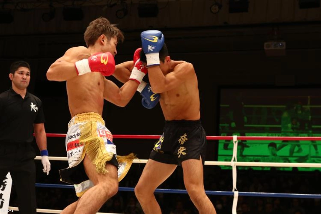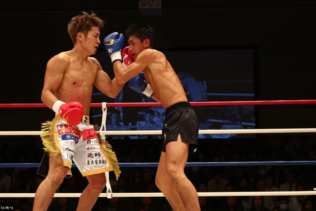 2R、ボディと顔面に強打を振るう大岩だが、朝久のディフェンスとブロックは強固でクリーンヒットを得られない。距離を保つ朝久は左ミドル・左三日月蹴りと決め、大岩のフックの中心を抜くようにストレートを打ち込む。顔面前蹴りを放つ朝久だが、大岩はこれを被弾しても勢いを発して前に出て、ボディストレート、左右フックの上下打ち。しかし朝久はこの強打に思ったほどヒットを与えて