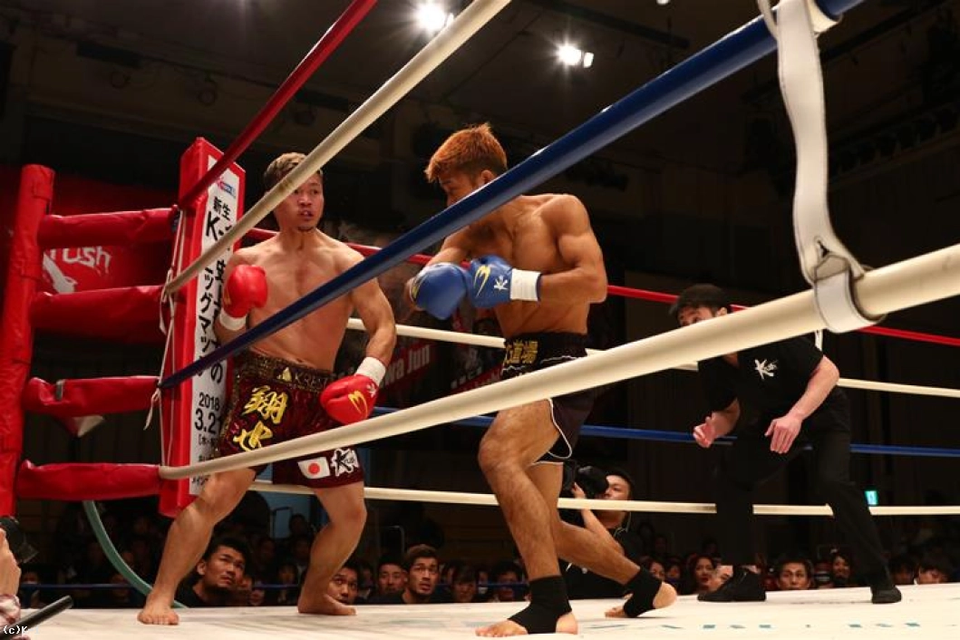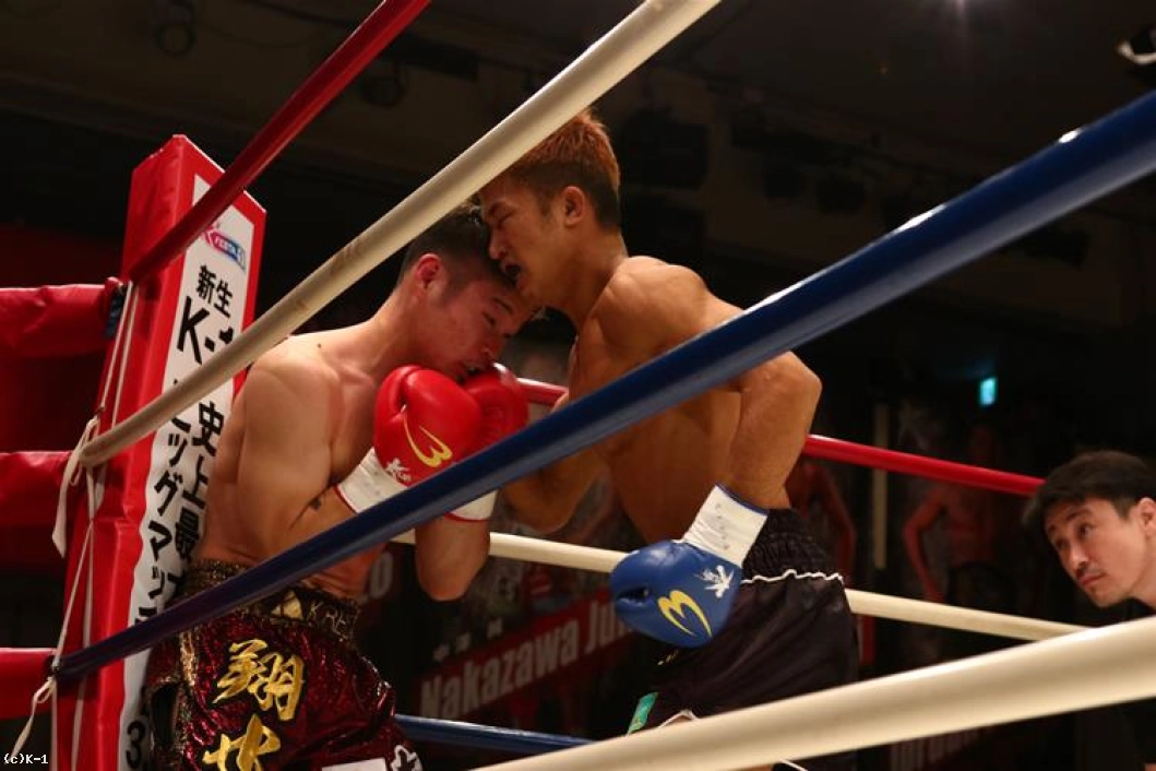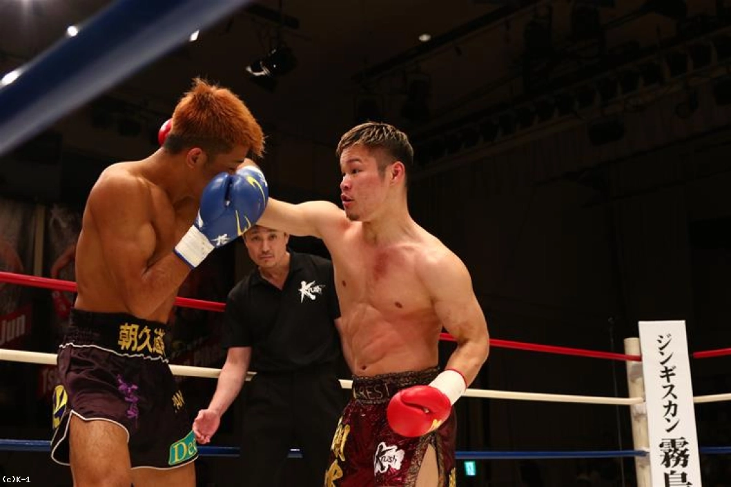 2Rも朝久は12cm上回る身長差を活かして桝本をロープに詰めるが、桝本はボディ、顔と左フックを打ち込んで朝久を遠ざける。1Rのようには朝久にプレッシャーを掛けさせていない桝本。桝本がボディと顔に左フックを振るうと朝久は下がる。