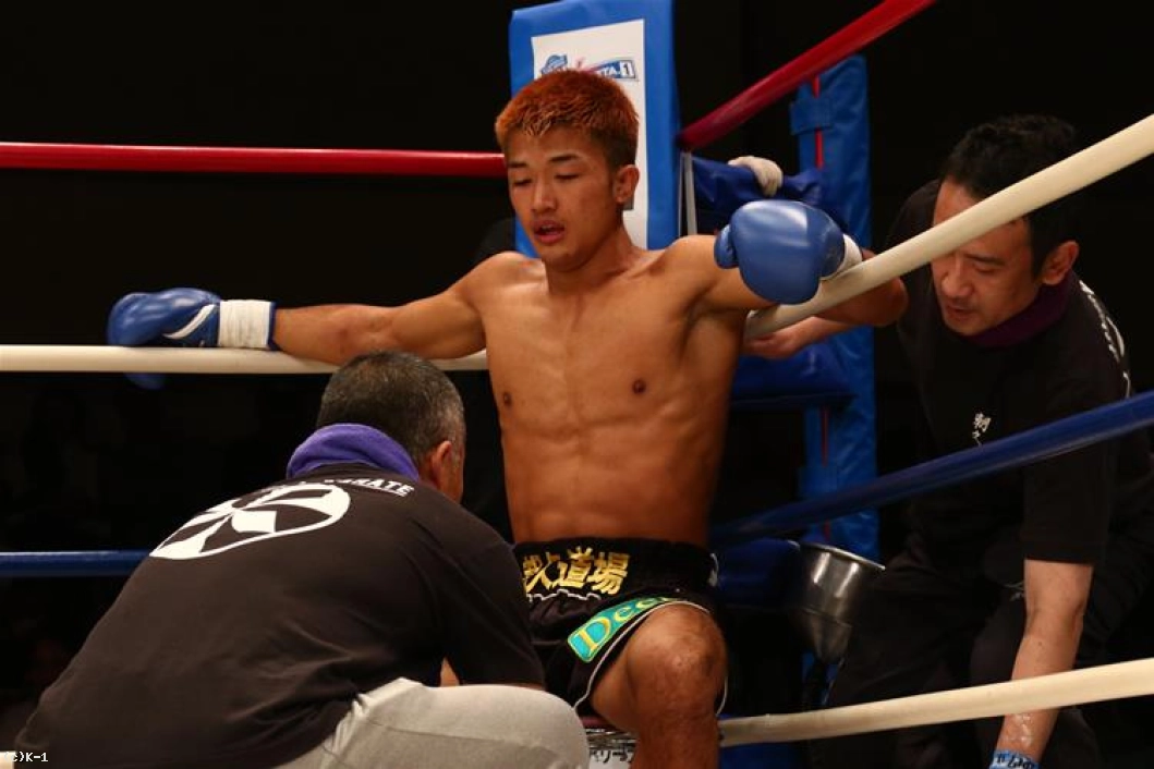 残り1分でブレークが掛かり、両者中央に戻る。流石にやや攻め疲れが感じられる朝久だが、左・右とフックを決める。しかし桝本はパワフルなショートとフックを決め反撃に移る。そして左アッパーから返しの左フックを決め、朝久からダウンを奪って初回を終える。
