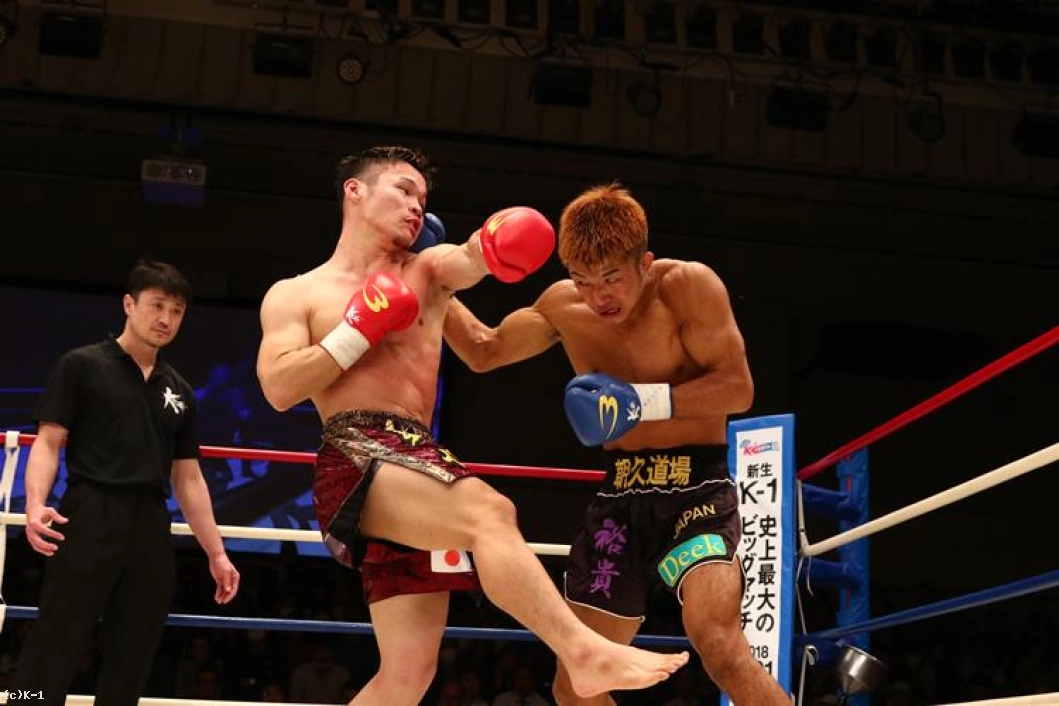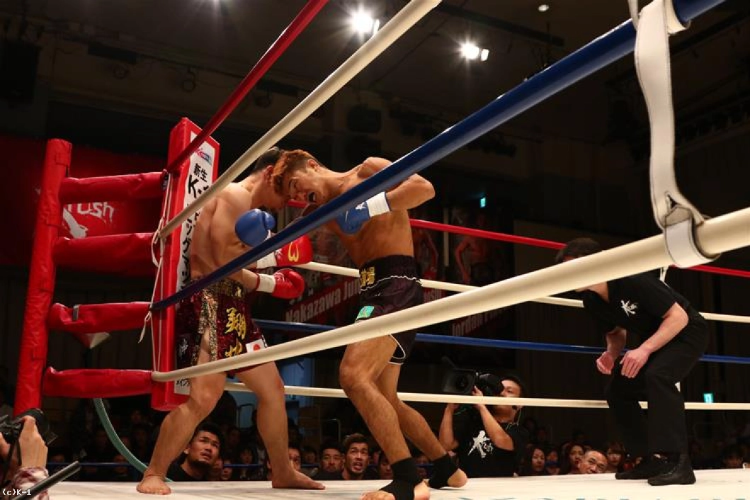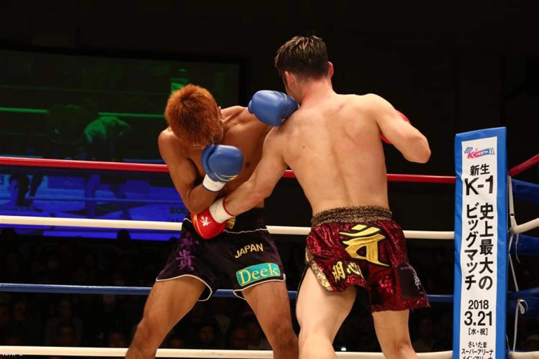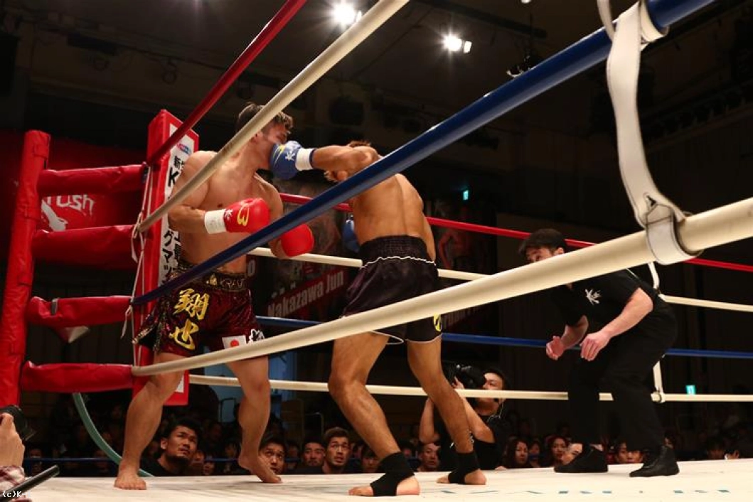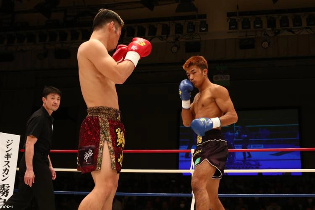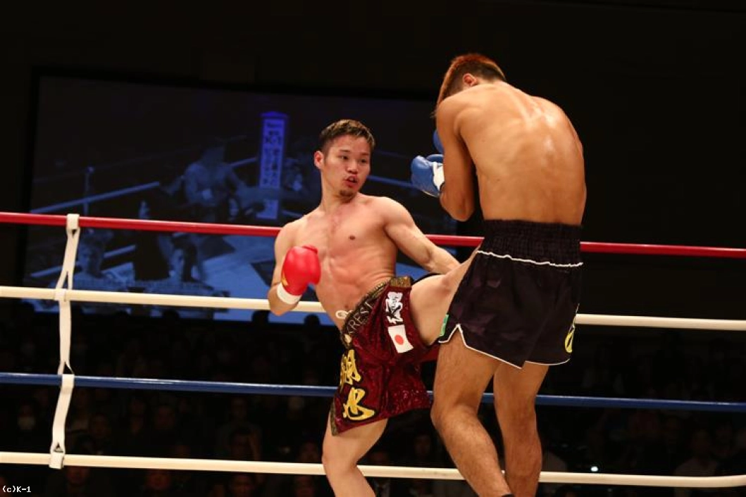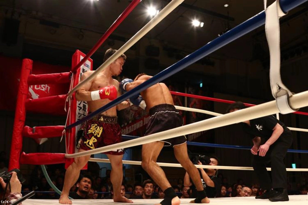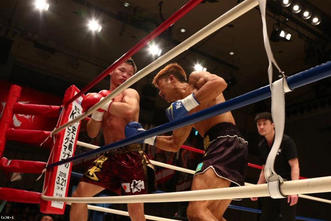 3R、朝久は連続の前蹴りからパンチを連打。しかし左フックが相打ちとなると打ち勝ったのは桝本。体勢を崩した朝久はクリンチしてこの窮地をしのぐ。ダメージか、これまでよりプレッシャーを与えられない朝久に対し、桝本は逆に前へ出て左フックを中心に攻撃して朝久を下がらせる。