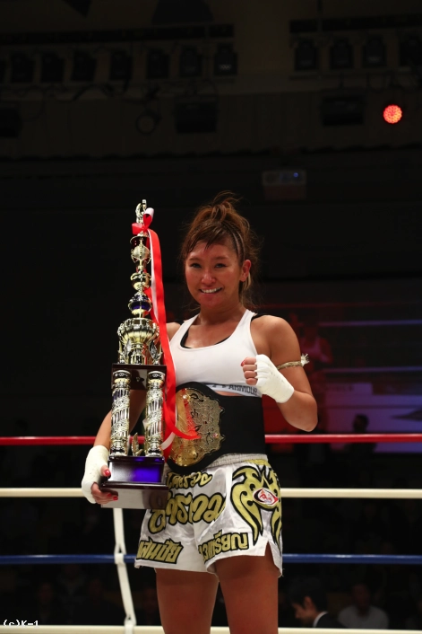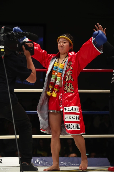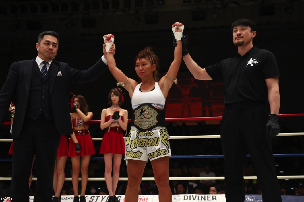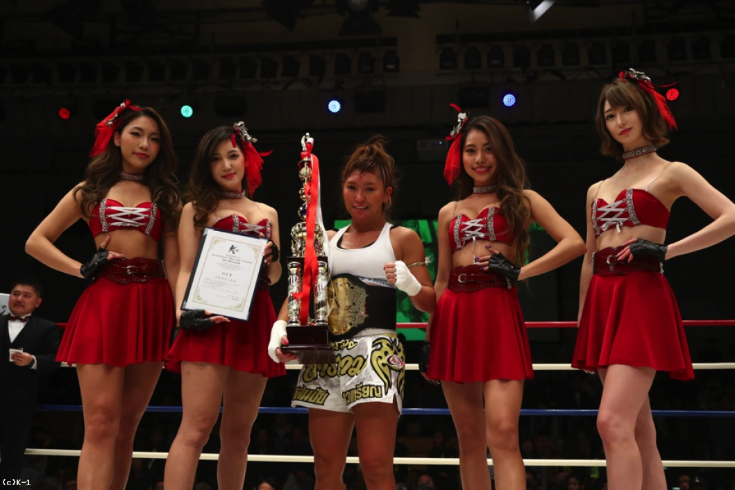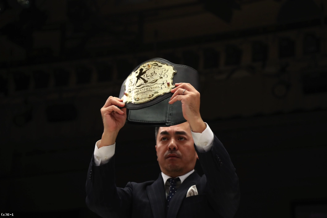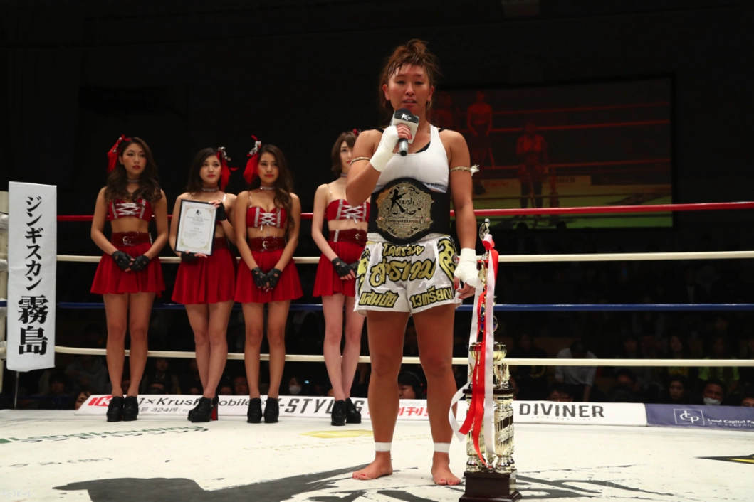 「(試合を振り返って?)いやあ、とにかくホッとしています。で、もう全ては勝つことだったんで、本当に今はホッとしているんですけど、また反省点もいろいろあって、動き悪かったなっていう中で最後はみんなの声援が本当にリングの上まで届いてがんばれたっていう感じだったので、終わってホッとしています。ありがとうございます。(対戦相手の印象は?)COMACHI選手がどうというより自分の動きがかなり悪かったので、そういうところを反省しながら。まあCOMACHI選手も凄いアグレッシブに来てたので、本当に勝ててホッとしています。(初代のベルトを実際に巻いてみて?)今はまだ実感が湧かなくて、夢の中にいるようなんですけど、また明日、明後日と日が経つにつれて、実感も湧いてくると思うので、王者としてしっかり君臨できるような闘いをしていきたいなと思っています」