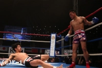 2R、ゴンナパーはサウスポーでこのラウンドに入り、前蹴り、横蹴り、左ミドルと放ち功也にパンチの間合いへ入らせない。しかしこれをかいくぐってパンチの距離となると左ストレート、左クロス、右ボディと功也が回転で上回る。だが、この合間に跳んでくるゴンナパーの左ローが強烈で功也はやや足を嫌そうな素振りを見せる。左ストレート、右フックとゴンナパーをロープに追い詰める功也だが、ここでゴンナパーが放った左ハイが当たってダウン。立ち上がるもダメージは色濃く、ゴンナパーが再びハイを交えたラッシュを仕掛け終了する。
