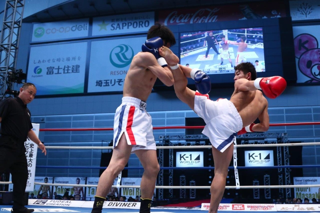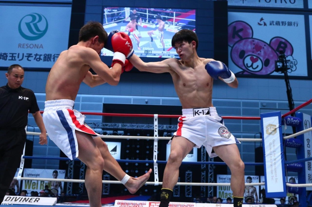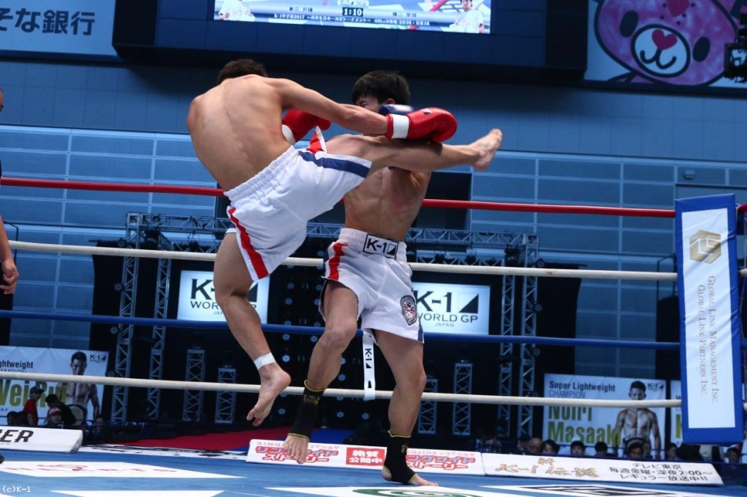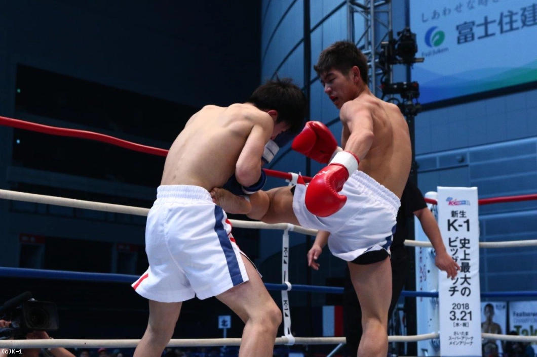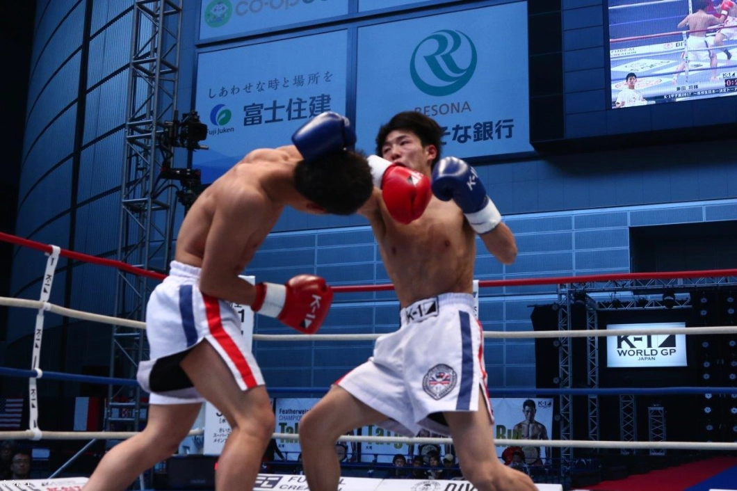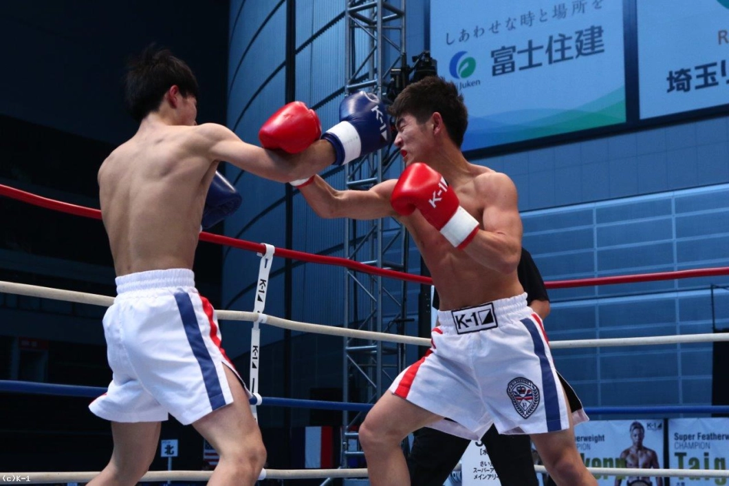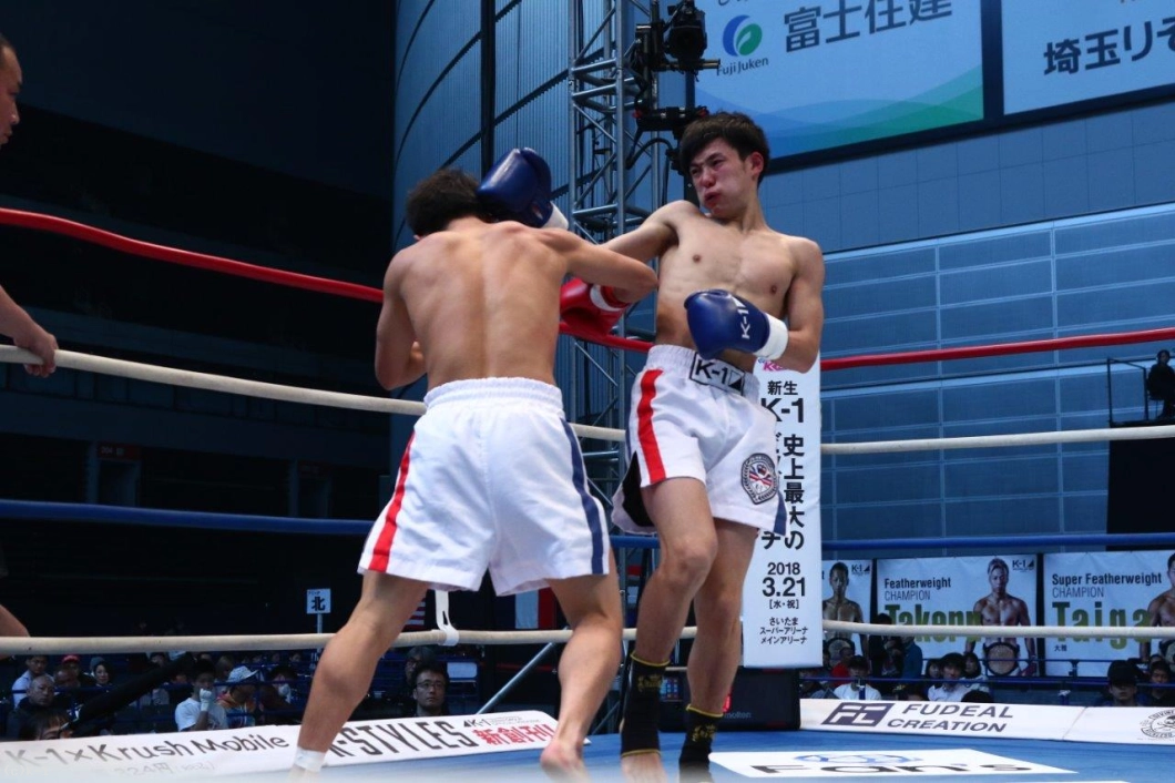 1R、両者ともにサウスポーからロー、ミドルを飛ばす。兼田は速いフットワークで前に出たかと思うと、横山が追い掛けてくると横へ回って攻撃を空転させる。横山の入り際に右フックのカウンターでとらえる兼田。初回は両者のスピードある蹴りが目につくラウンドとなる。