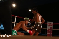 2R、芦澤のハイキックをガードした河野が右ストレート・左フックとパンチをまとめてダウンを奪う。再開後、芦澤は左フック、右ストレート、ヒザ蹴りで猛攻を仕掛ける。一気に手数を増やして前に出ていく芦澤。河野もハイキックとパンチを返して応戦する。