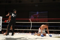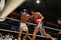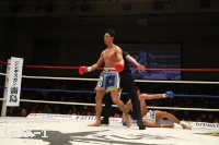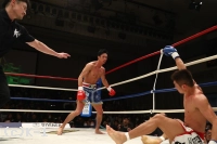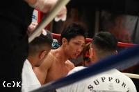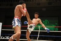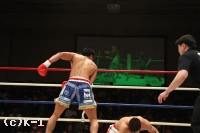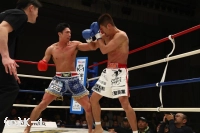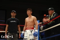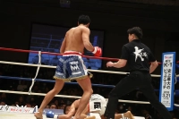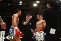 2R、牧平はローを当てて意識を下げさせた後で左ハイキック。これを受けて塚越は後退し、牧平は攻勢モードへと変わり、蹴りだけでなく左ストレートもヒット。優勢となった牧平だったが、塚越は前に出て牧平をロープに詰めると左フックを打ち込みダウンを奪取。