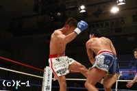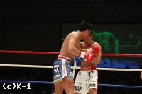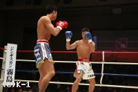 1R、サウスポーの構えから蹴りを見舞わんとする牧平に対し、塚越は開始からグッと前に出てプレッシャーを与え、右ストレート、左フックでとらえる。被弾する牧平だが、左ローで塚越の奥足・前足ととらえていく。だが塚越はこれで作戦を変えず、右ストレート、左フックでとらえる。しかし牧平はやはり左ローを続行。塚越は痛そうな仕草をやや見せる。