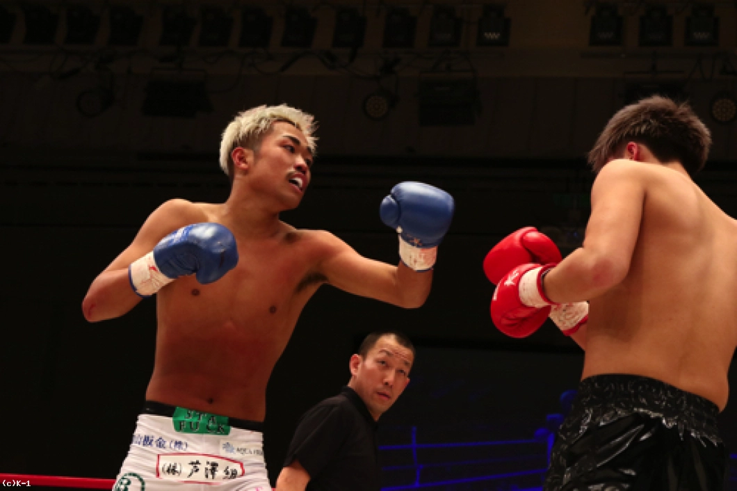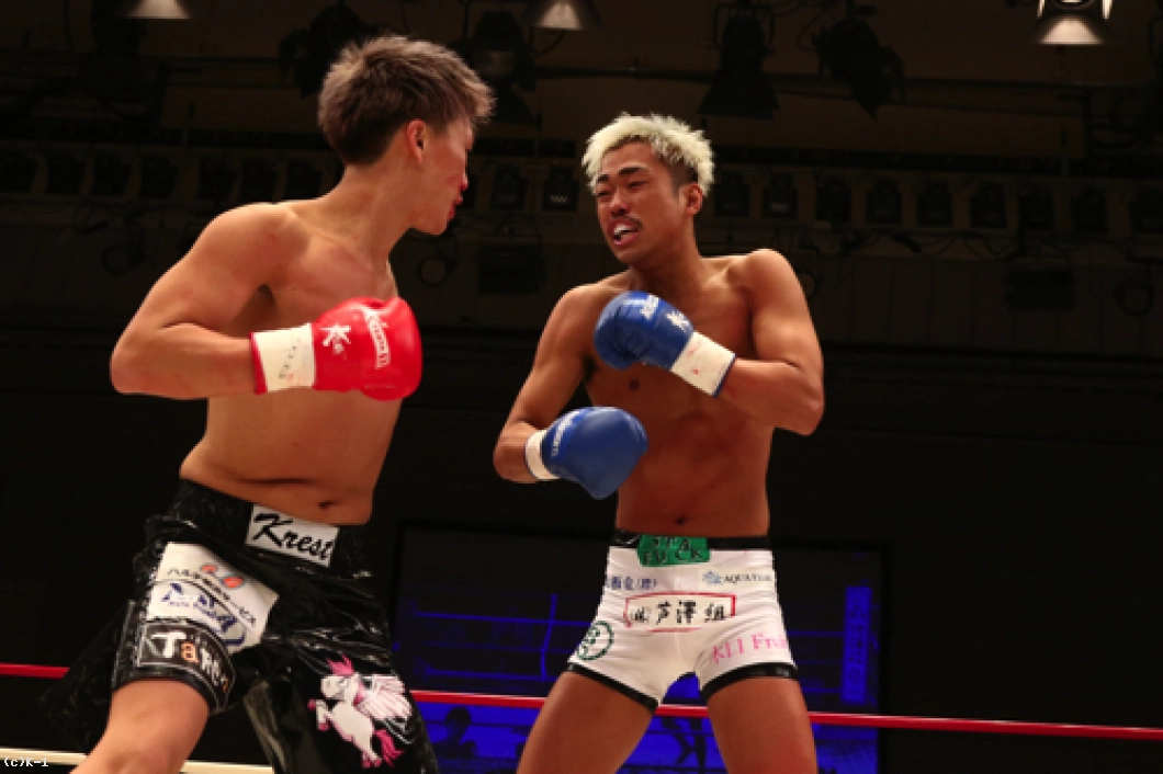 攻めたい佐野だが、ダメージで手数が出ない。それでも左ミドル、左ハイと放つものの、芦澤はそこから右ストレートと左フックで猛攻。芦澤のアグレッシブさに押されて佐野は劣勢となり、ロープ際で打たれる。芦澤が当て勘のよさを際立たせ、右ストレート、左フックでさらに攻める。佐野も左ハイを決めてフラつかせるのだが、芦澤が再び攻勢に戻って終了。判定は30−28、29−29、29−28の2−0で芦澤。ラフファイトの芦澤ワールドに引き込み勝利した。