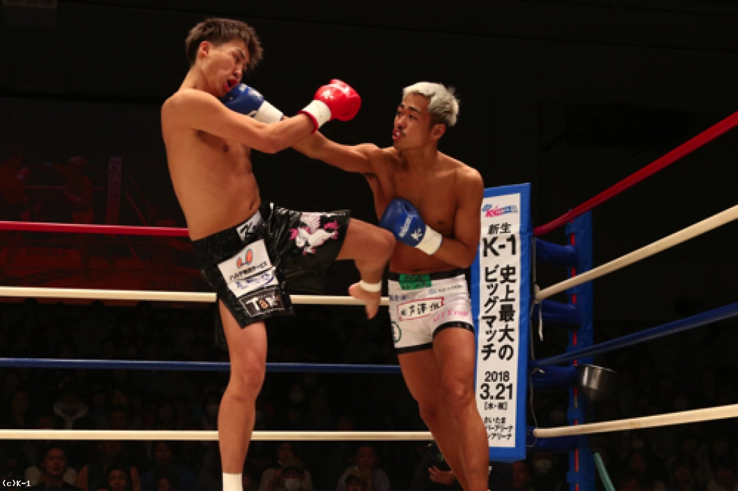 1R、芦澤はロープを背にリングを左右に回っていく。そこからローを放つが、佐野はすぐにローをリターン。そして左ミドル、三日月蹴りと芦澤に放っていく。芦澤は左ボディ、右ストレートと放って佐野を遠ざけんとするが、佐野はプレッシャーを落とさず、逆に芦澤が出てくると右ストレート、左フックとカウンターを狙う。芦澤も飛び出しながらの右クロスなど当てるのだが、佐野は一瞬こそ下がってもまた圧力を掛けてくる。そして前に出る芦澤をサイドにかわして左フックを当てる。