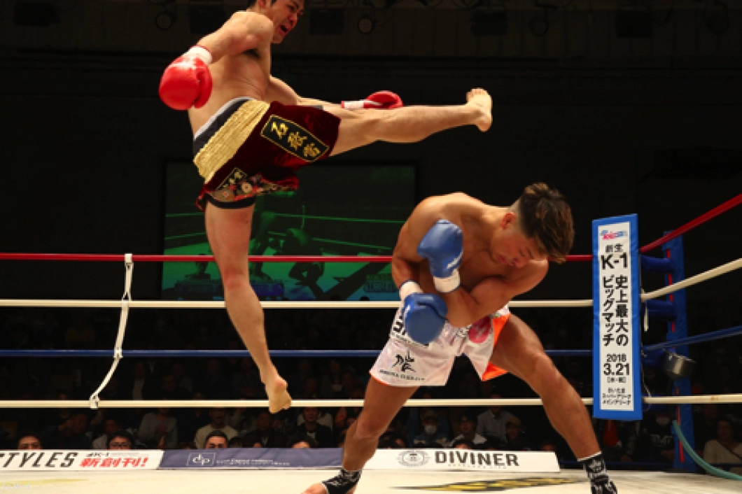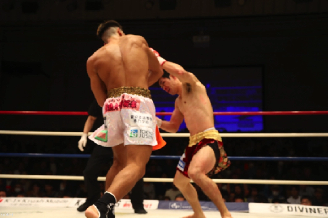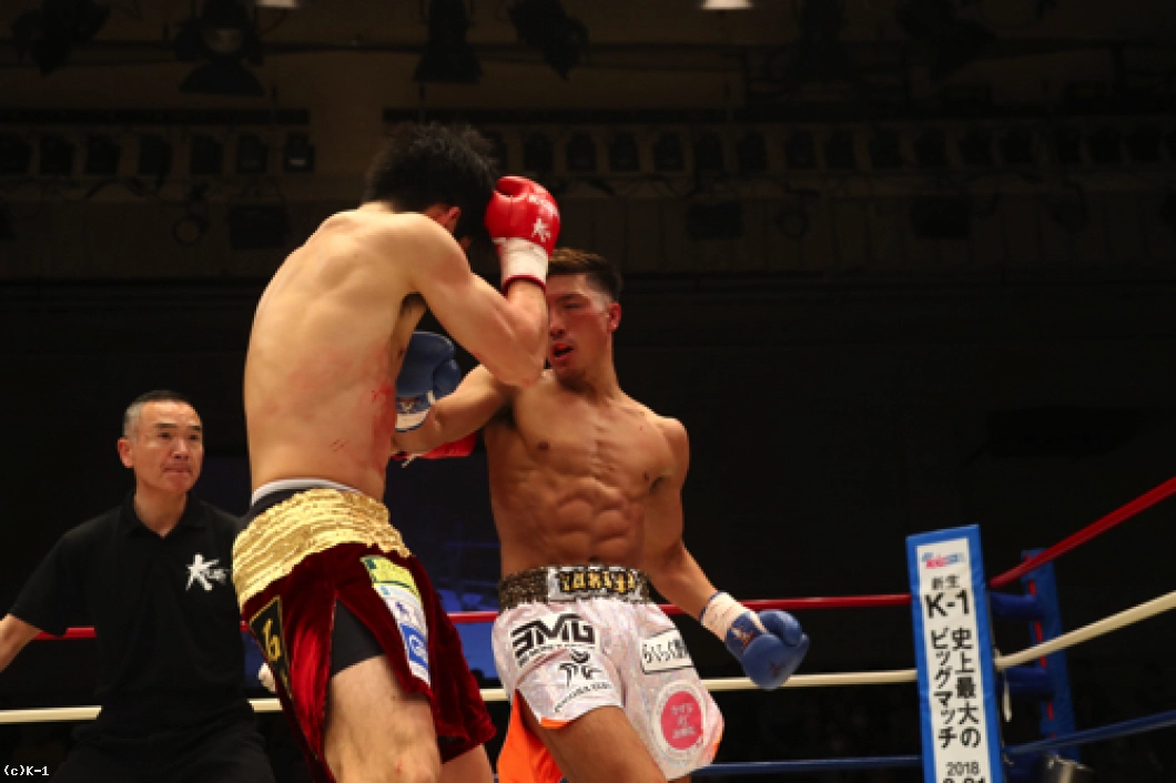 だが、FUMIYAはパンチに蹴りを混ぜた攻撃で、ジャブ、ミドル、跳びヒザと再び中村を攻める。だが、守勢の中村はここで左アッパーから強打の右フックでFUMIYAをフラつかせ、続いて跳び蹴りで襲うが、これはFUMIYAがダッキングで間一髪でかわす。FUMIYAが放った右フックをかわした中村だが、続いて放ったバックブローでFUMIYAがダウンを奪い返して2Rを終える。